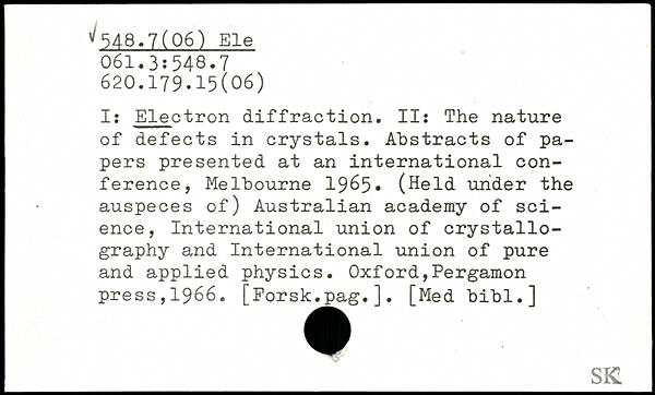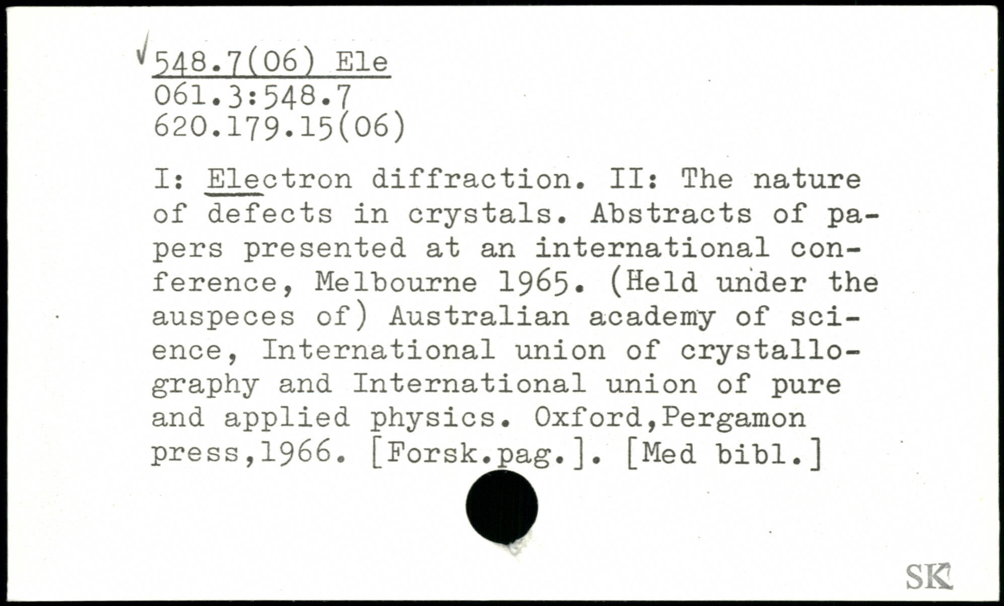 I; Electron diffraction. II: The nature of defects in crystals. Abstracts of papers presented at an international conference, Melbourne 1965. (Held under the auspeces of) Australian academy of science, International union of crystallography and International union of pure and applied physics.