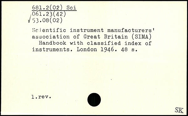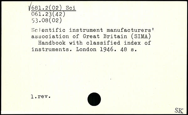 Scientific instrument manufacturers' association of Great Britain (SIMA) Handbook with classified index of instruments.