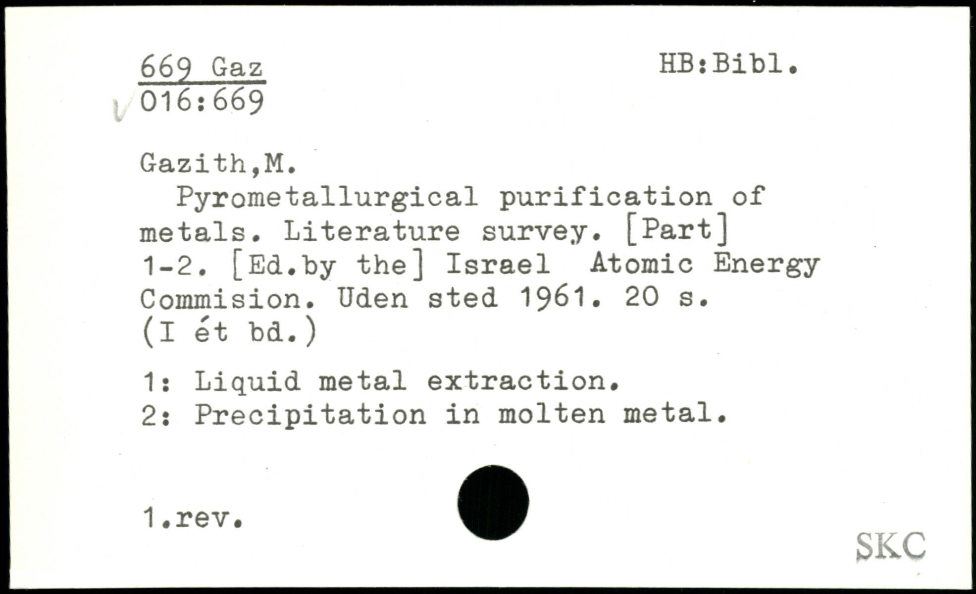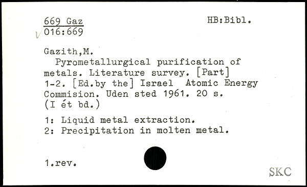 Pyrometallurgical purification of metais. Literature survey. [Part] 1-2. [Ed.by the] Israël Atomic Energy Commision. Uden sted 1961.