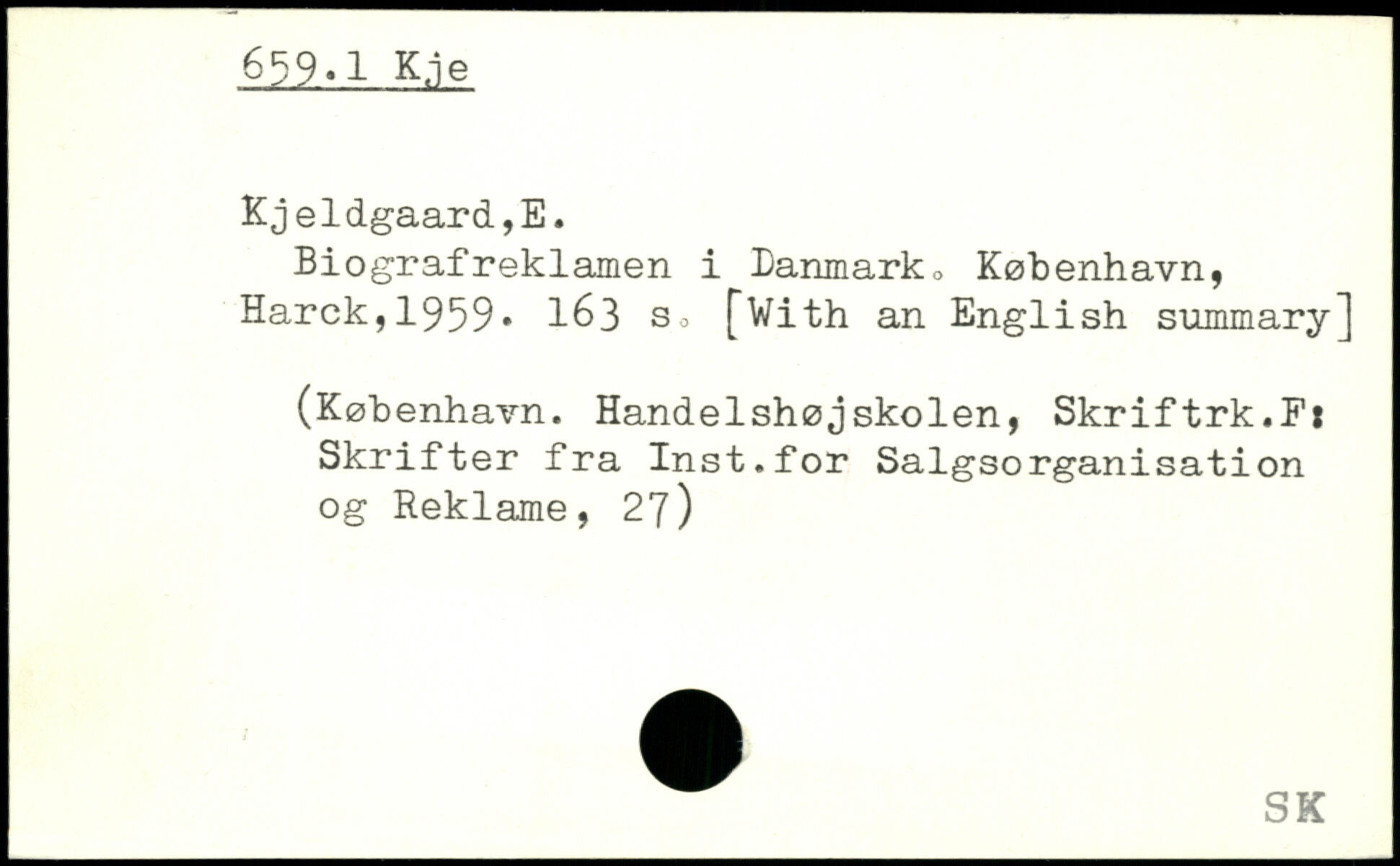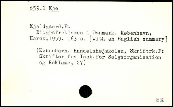 Biografreklamen i Danmarko København, Harck,1959. 163 s, [With an English summary] (København. Handelshøjskolen, Skriftrk.Fi Skrifter fra Inst.for Salgsorganisation og Reklame, 27)
