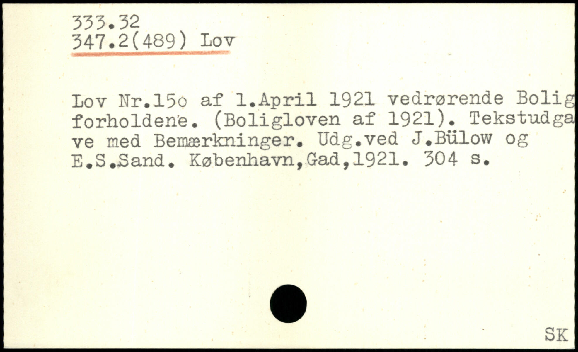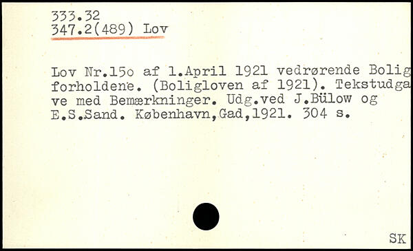 Lov Nr.l5o af 1.April 1921 vedrørende Bolig forholdene. (Boligloven af 1921). lekstudga ve med Bemærkninger. Udg.ved J.Bulow og E.S .Band.
