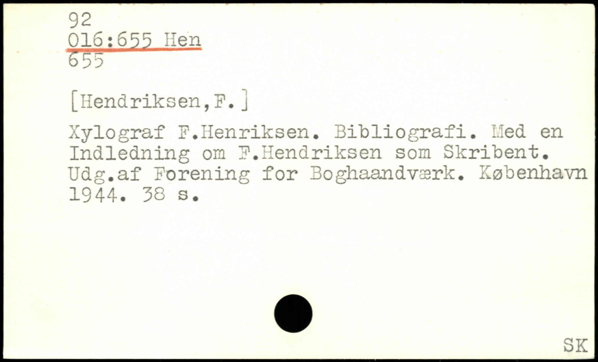 [Hendriksen,F.j Xylograf F.Henriksen. Bibliografi. Med en Indledning om F.Hendriksen som Skribent. Udg.af Forening for Boghaandværk.