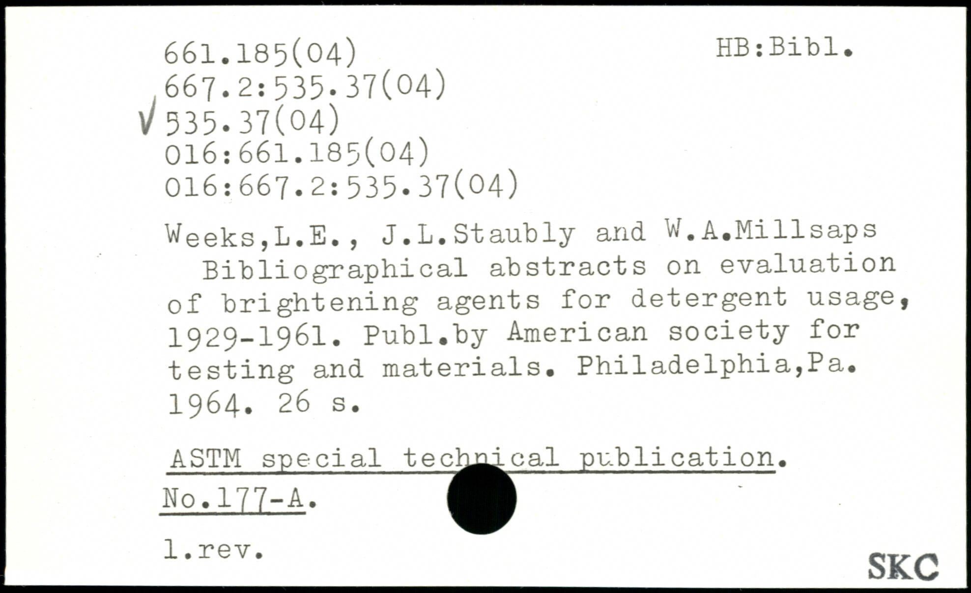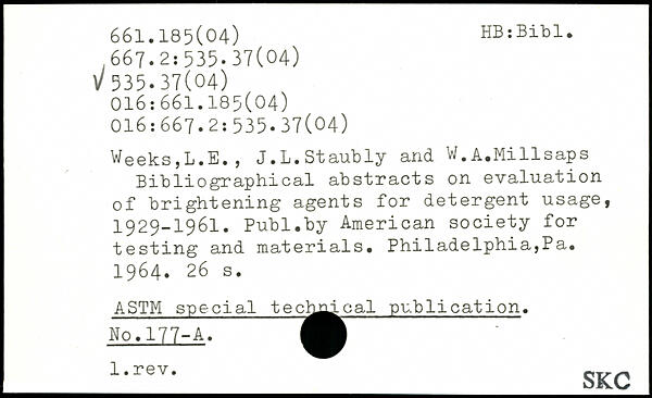 Weeks,L.E., J.L.Staubly and W.A.Millsaps Bibliographical abstracts on evaluation of brightening agents for detergent usage, 1929-1961.