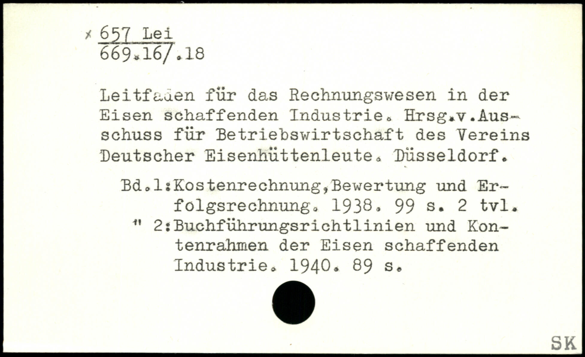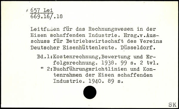 Leitfauen für das Rechnungswesen in der Eisen schaffenden Industrie. Hrsg.v.Ausschuss für Betriebswirtschaft des Vereins 'Deutscher Eisenhüttenleute. Düsseldorf. Bd. ^Kostenrechnung,Bewertung und Er-folgsrechnungo 1938.