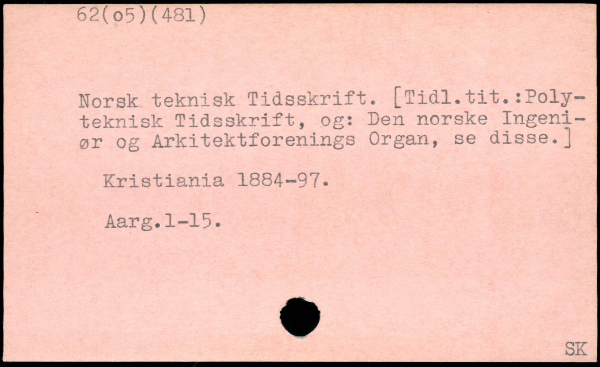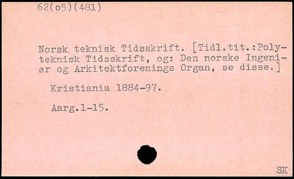Norsk teknisk Tidsskrift. [Tidl.tit.:Polyteknisk Tidsskrift, og: Den norske Ingeniør og Arkitektforenings Organ, se disse.] Kristiania 1884-97. Aarg.1-15.