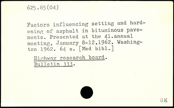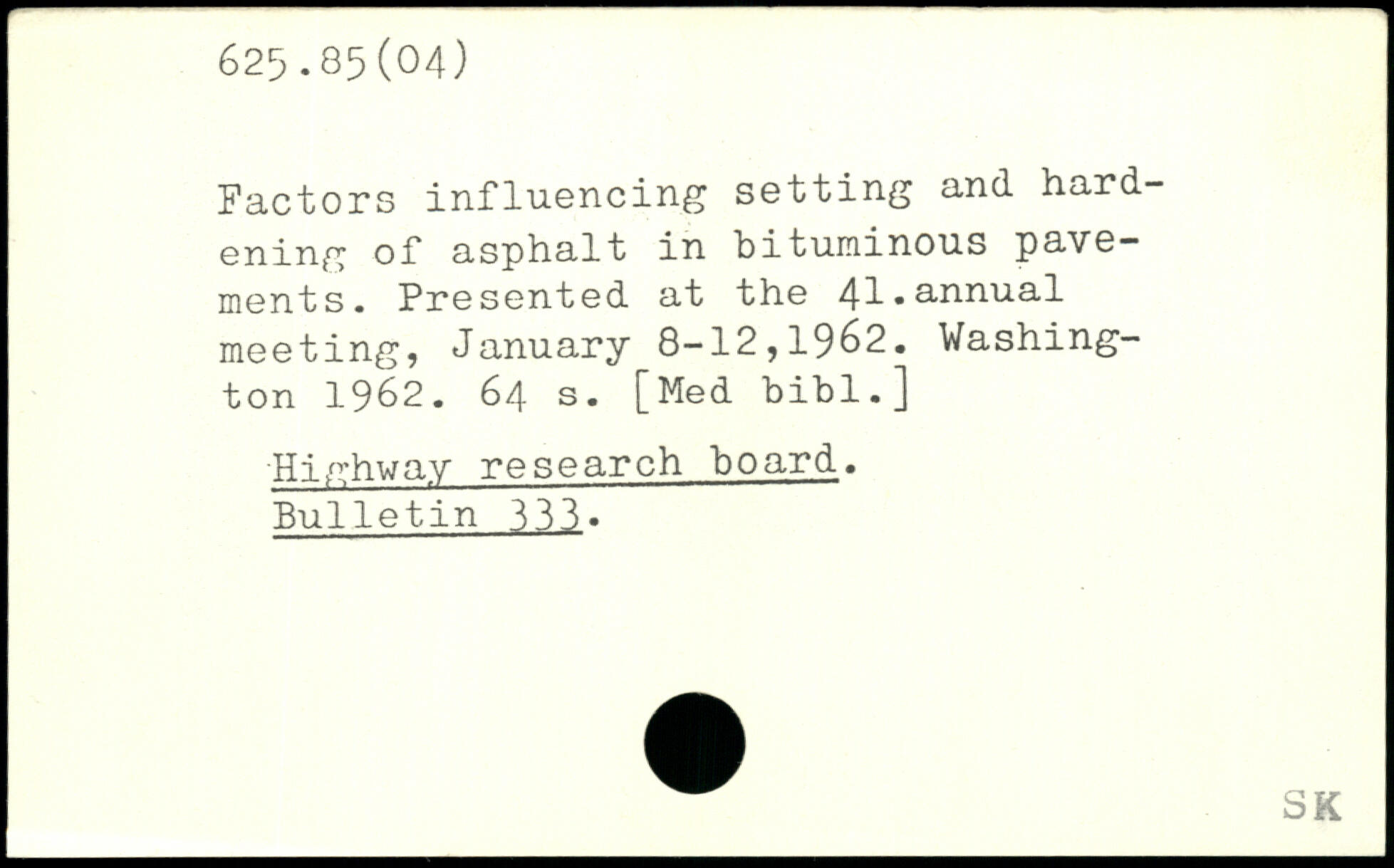 Factors influencing setting and hardening of asphalt in bituminous pavements. Presented at the 41.annual meeting, January 8-12,1962.