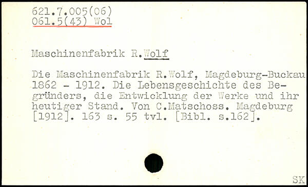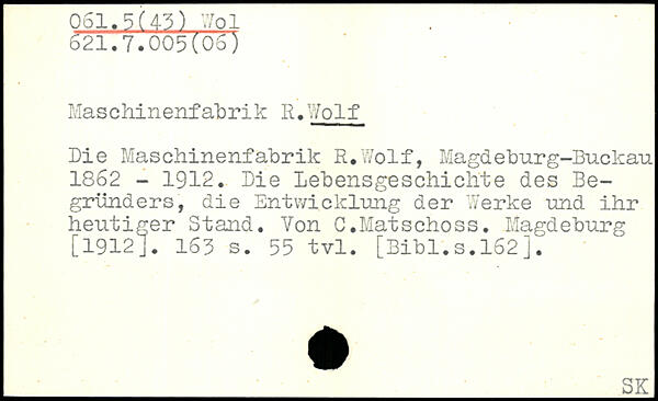 Die Maschinenfabrik R.Wolf, Magdeburg-Buckau 1862 - 1912. Die Lebensgeschichte des Begründers, die Entwicklung der Werke und ihr heutiger Stand. Von G.Matschoss. Magdeburg [1912].