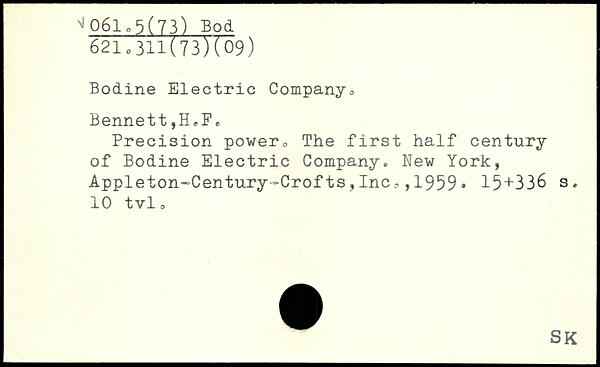 Bodine Electric Company,, Bennett,H.Fe Precision power, The first half century of Bodine Electric Company, New York, Appleton-Century-Crofts,Inc0,1959.