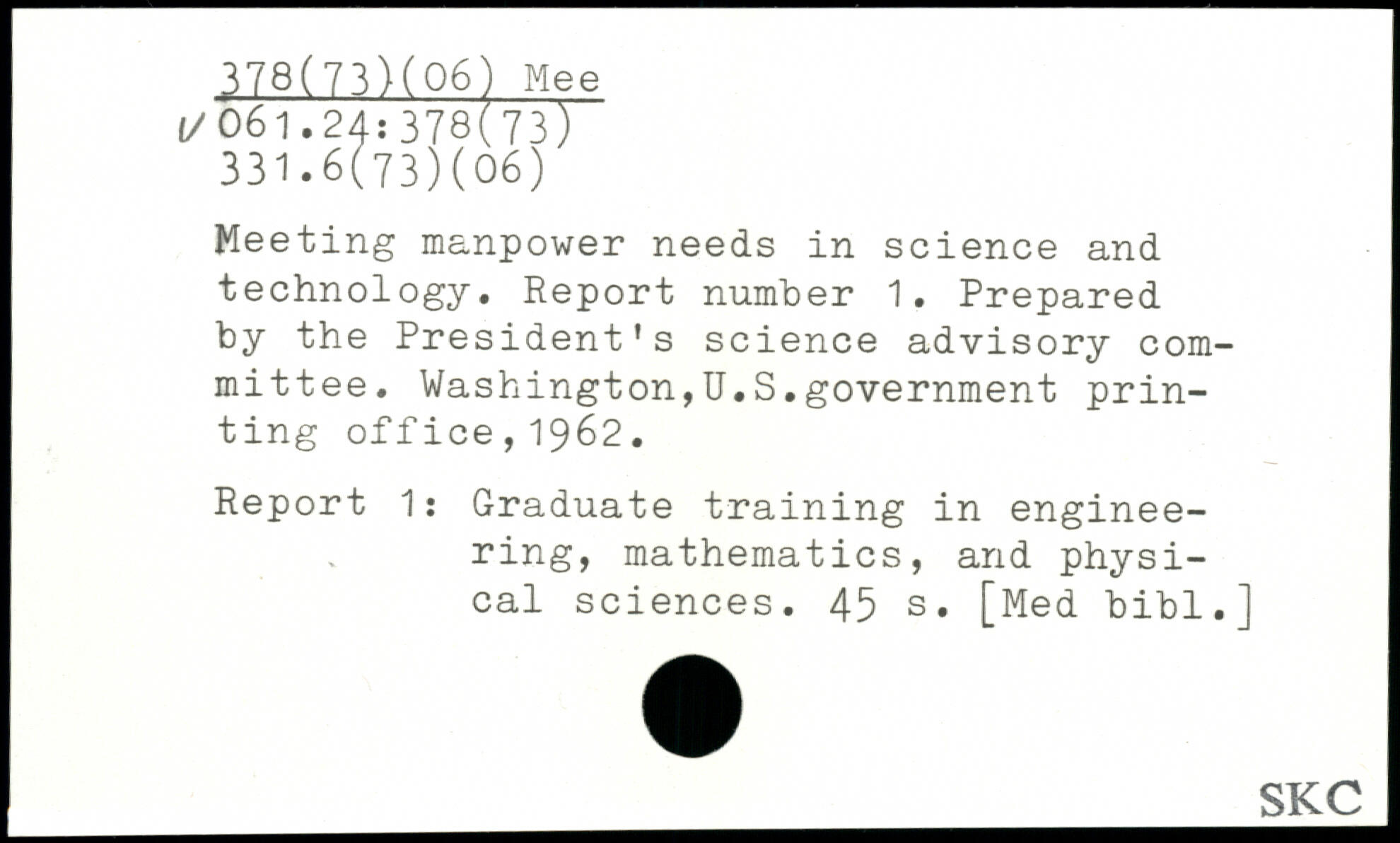 Meeting manpower needs in science and technology. Report number 1. Prepared by the President's science advisory committee. Washington,U.S.government printing office,1962. Report 1: Graduate training in engineering, mathematics, and physi- j cal sciences.
