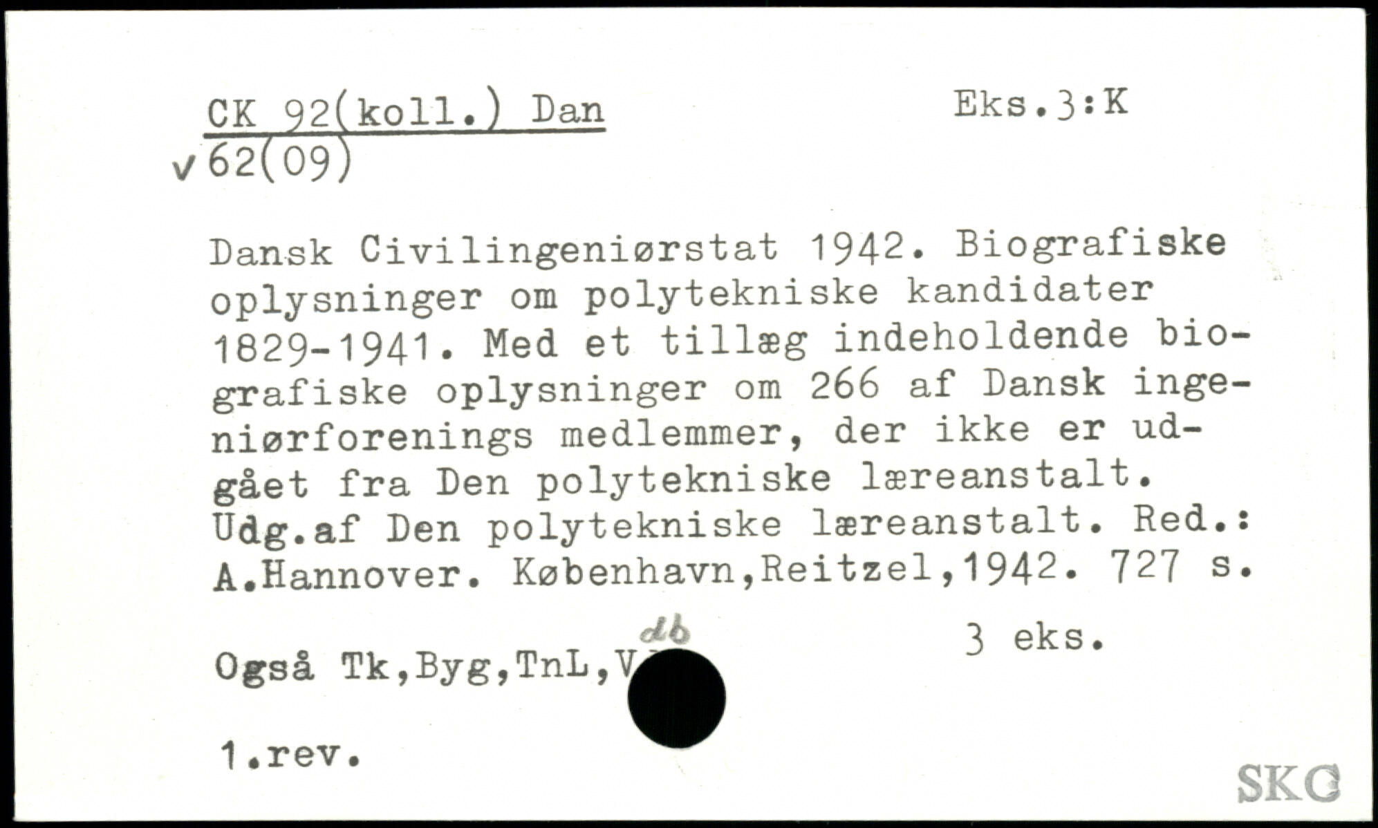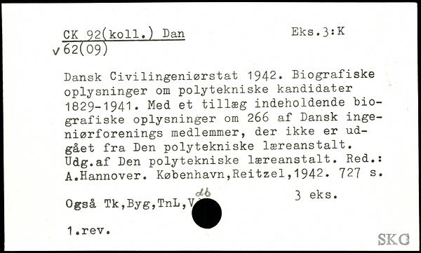Dansk Civilingeniørstat 1942. Biografiske oplysninger oin polytekniske kandidater 1829-1941. Med et tillæg indeholdende biografiske oplysninger om 266 af Dansk ingeniørf orenings medlemmer, der ikke er udgået fra Den polytekniske læreanstalt. Udg.af Den polytekniske læreanstalt. Red.: A.Hannover.