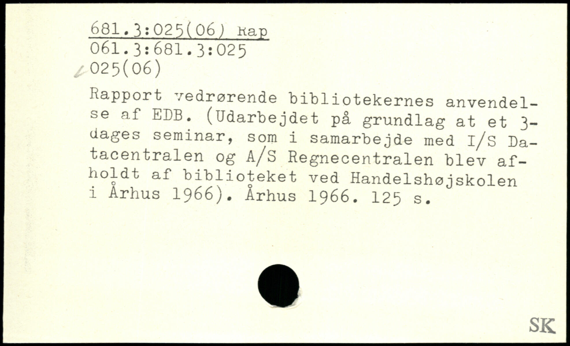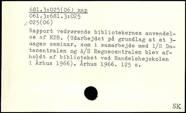 Rapport vedrørende bibliotekernes anvendelse af EDB. (Udarbejdet på grundlag at et 3-dages seminar, som i samarbejde med i/s Datacentralen og å/S Regnecentralen blev afholdt af biblioteket ved Handelshøjskolen i Arhus 1966). Århus 1966.