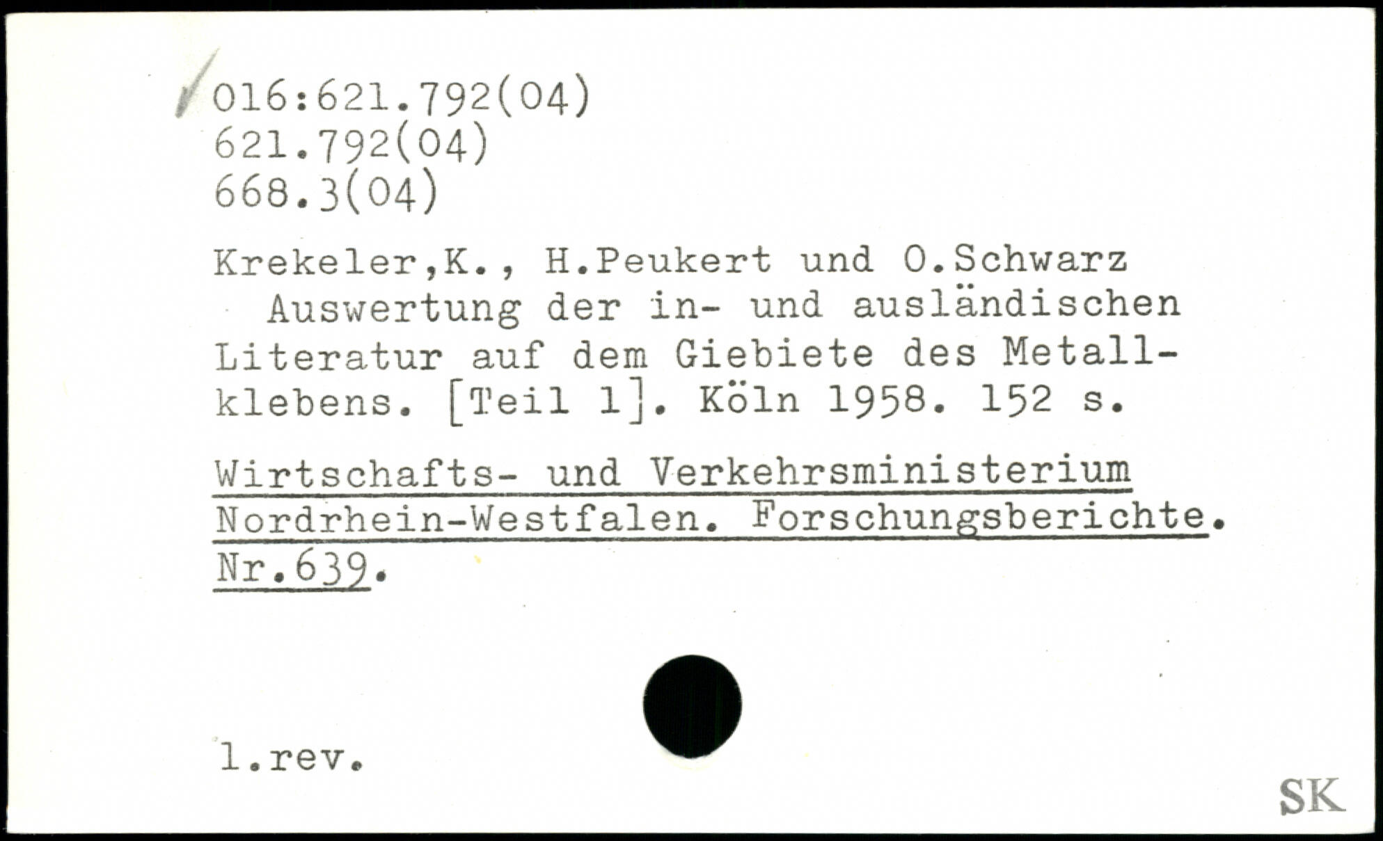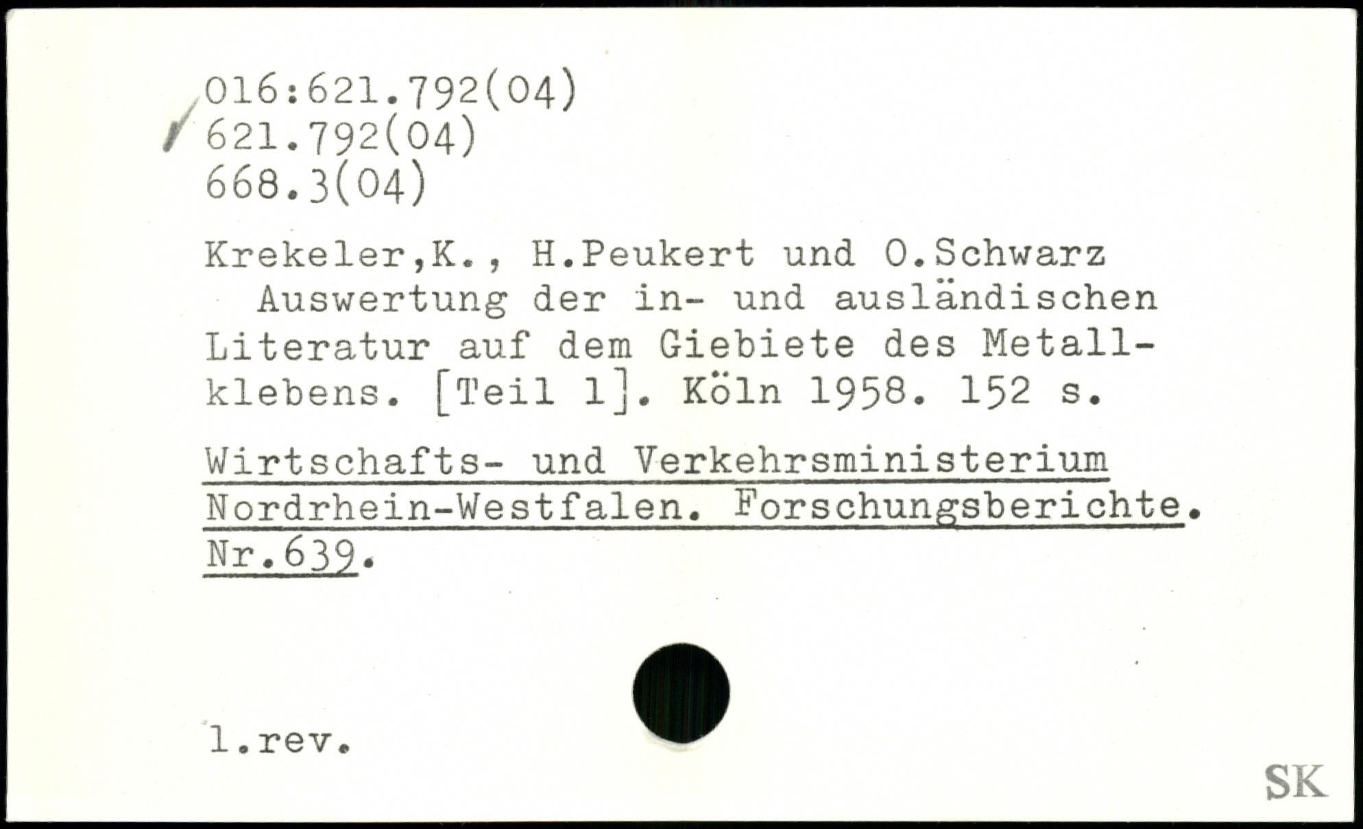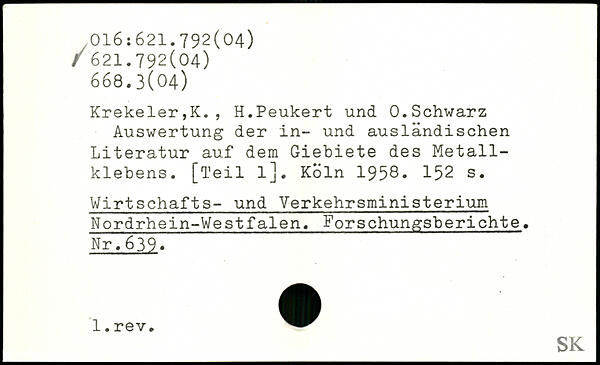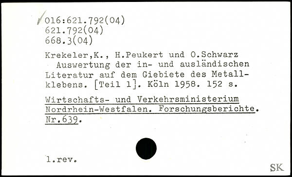 Krekeler,K., H.Peukert und 0.Schwarz Auswertung der in- und ausländischen Literatur auf dem Giebiete des Metallklebens. [Teil lj.