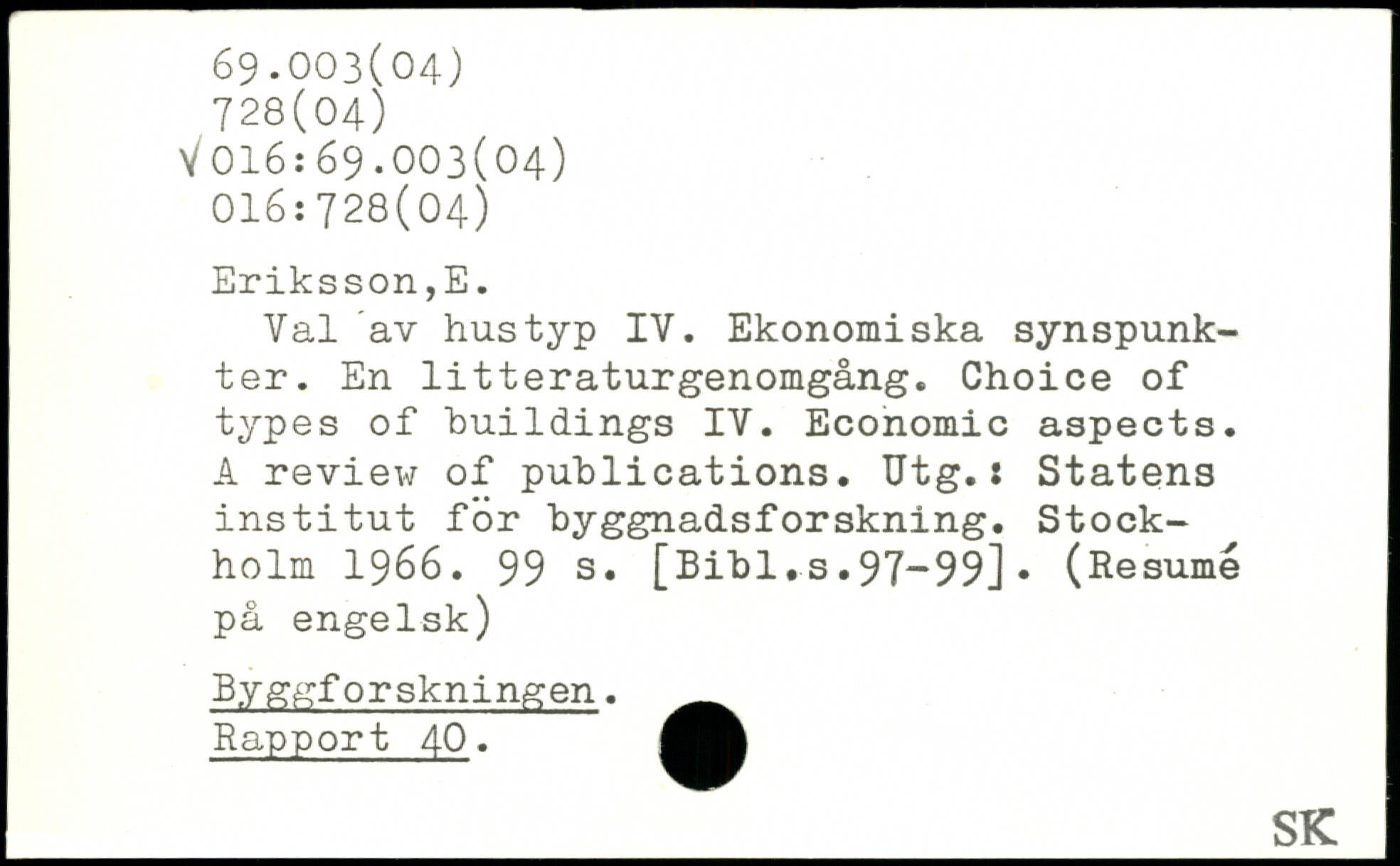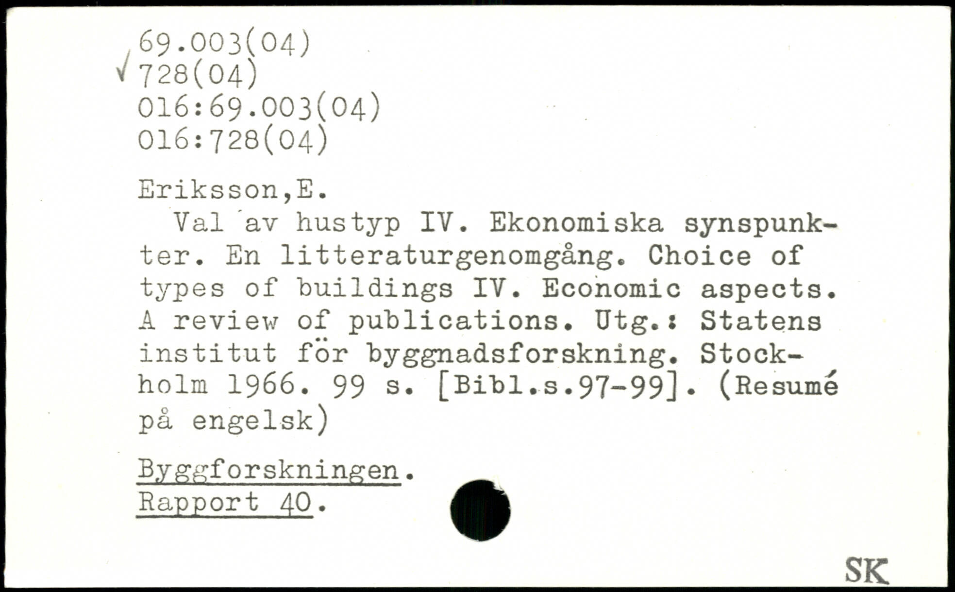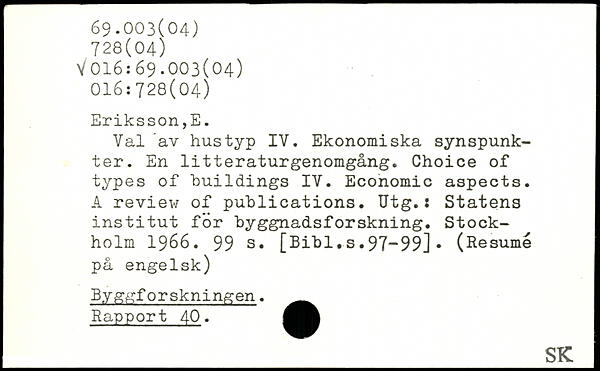 Val av hustyp IV. Ekonomiska synspunkter. En litteraturgenomgång. Choice of types of huildings IV. Economic aspects. A review of publications. Utg.s Statens institut för byggnadsforskning.