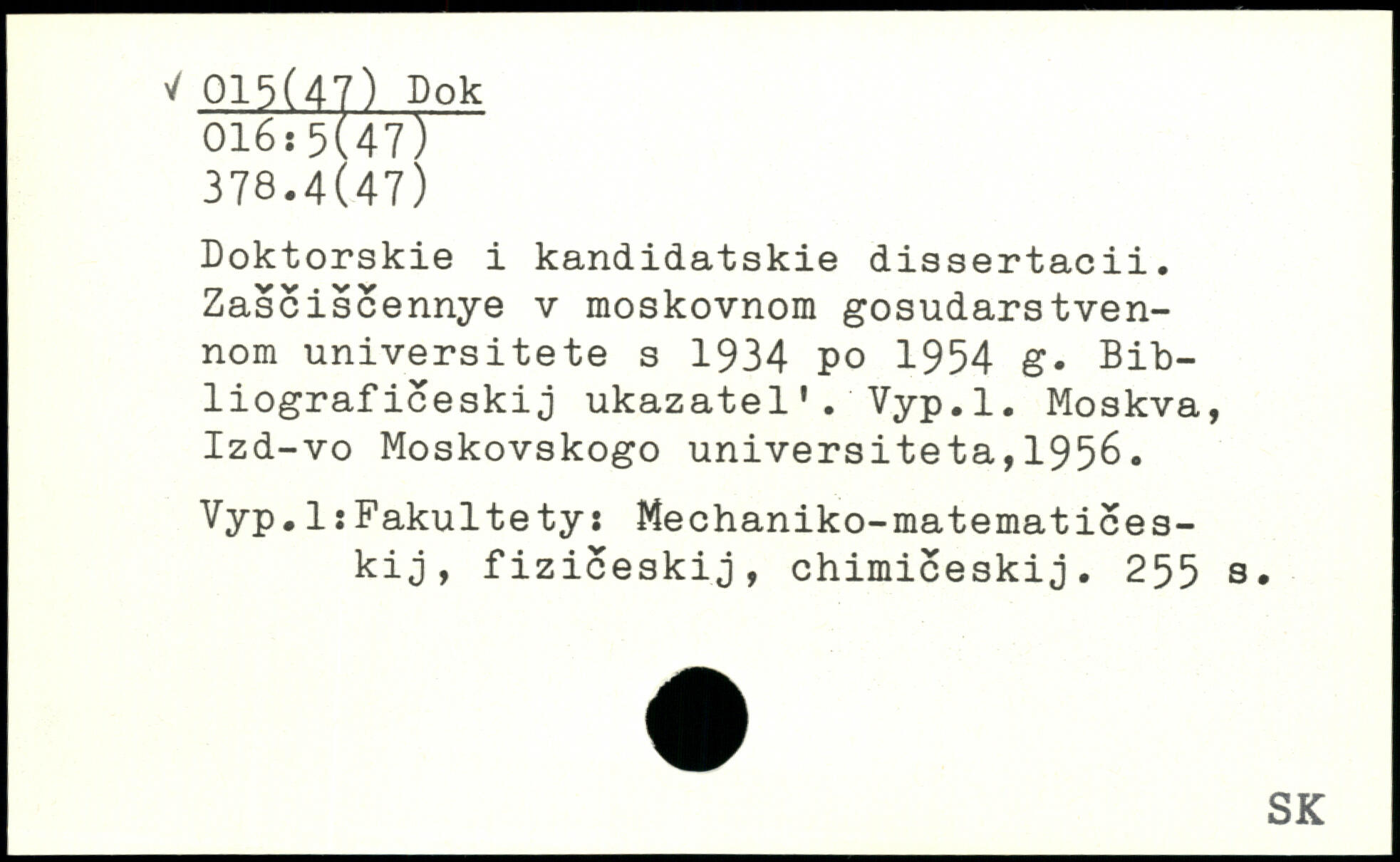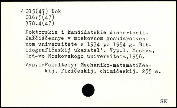 Doktorskie i kandidatskie dissertacii. Zasciscennye v moskovnom gosudarstven-nom universitete s 1934 po 1954 g. Bibliograf iceskij ukazatel'. Vyp.1.