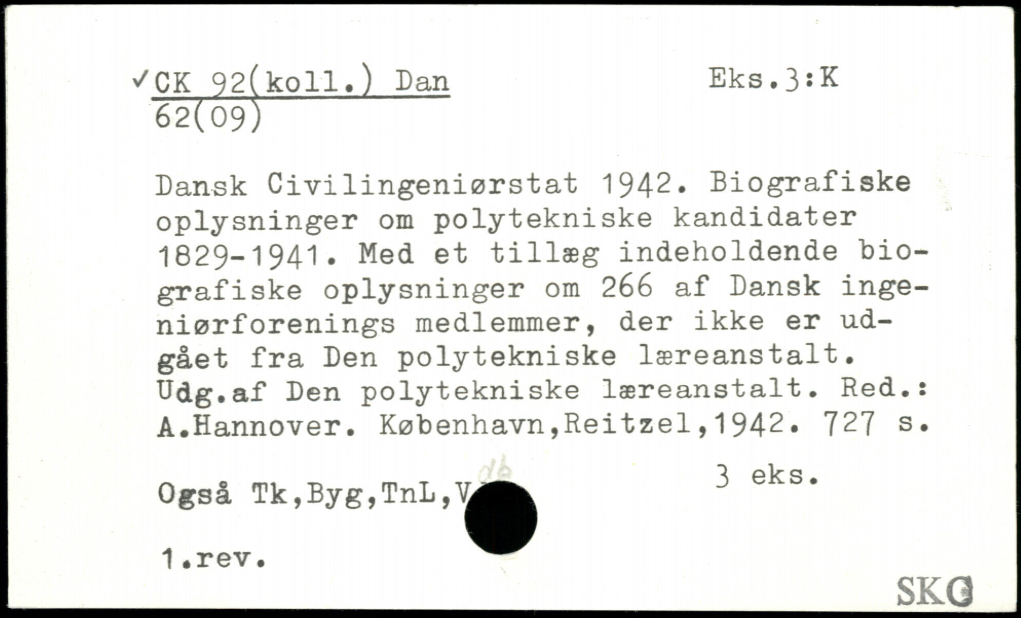 Dansk Civilingeniørstat 1942. Biografiske oplysninger om polytekniske kandidater 1829-1941. Med et tillæg indeholdende biografiske oplysninger om 266 af Dansk ingeniørf orenings medlemmer, der ikke er udgået fra Den polytekniske læreanstalt. Udg.af Den polytekniske læreanstalt. Red.: A.Hannover.
