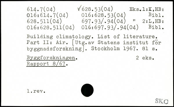 Building climatology. List of literature. Part II: Air. [Utg.av Statens institut for byggnadsforskning].