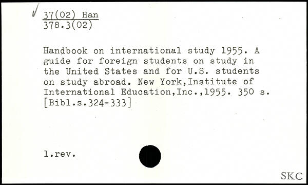 Handbook on international study 1955. A guide for foreign students on study in the United States and for U.S. students on study abroad. New York,Institute of International Education,Inc1955.