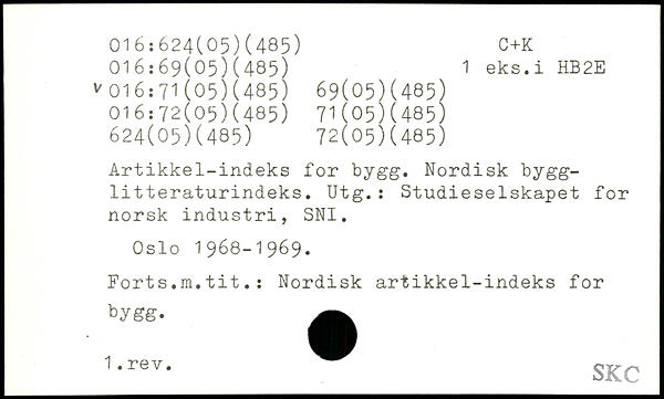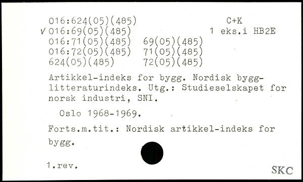 Artikkel-indeks for bygg. Nordisk bygglit teraturindeks. Utg.: Studieselskapet for norsk industri, SNI. Oslo 1968-1969. Forts.m.tit.: Nordisk artikkel-indeks for bygg- 1.1-ev. SKC