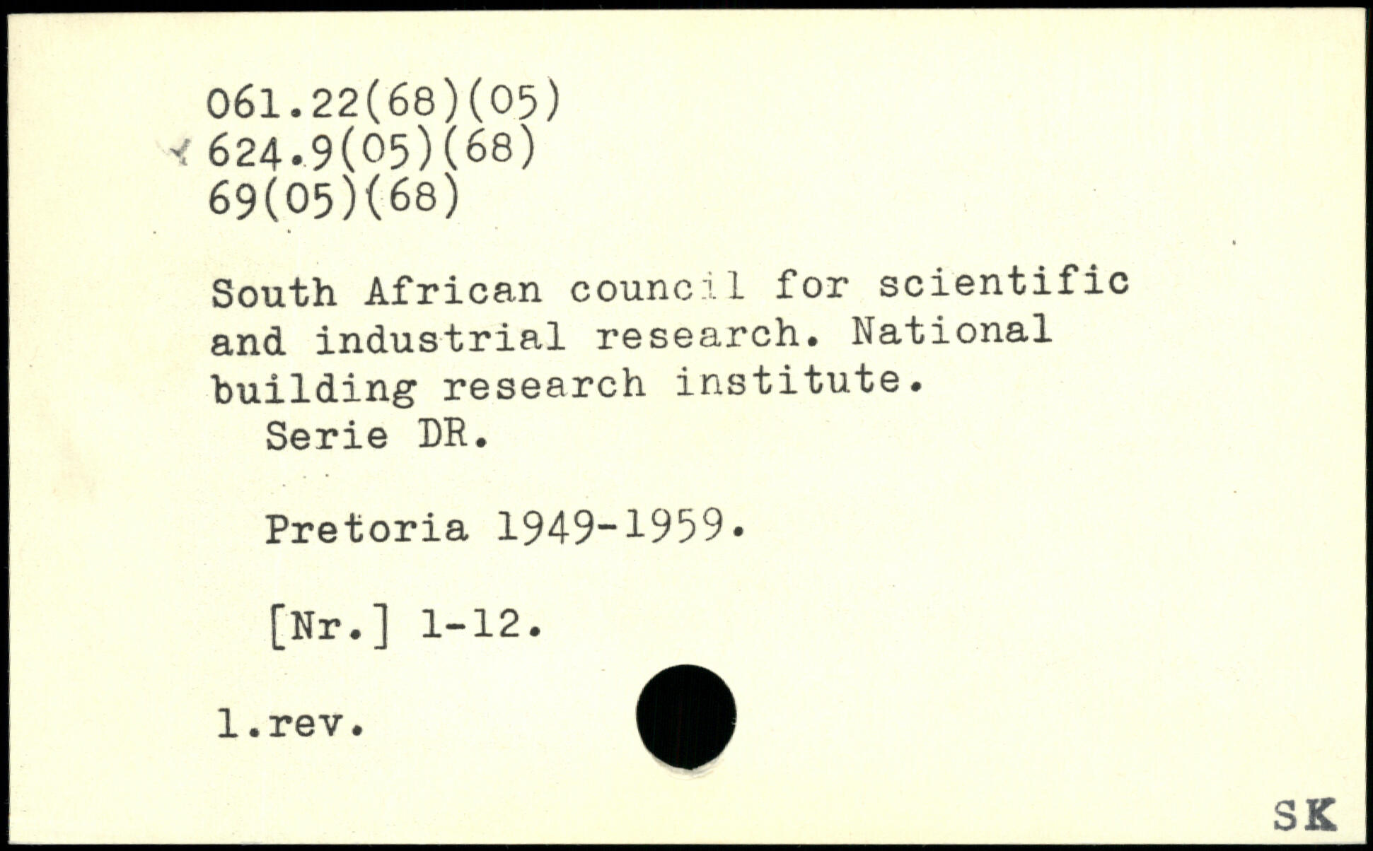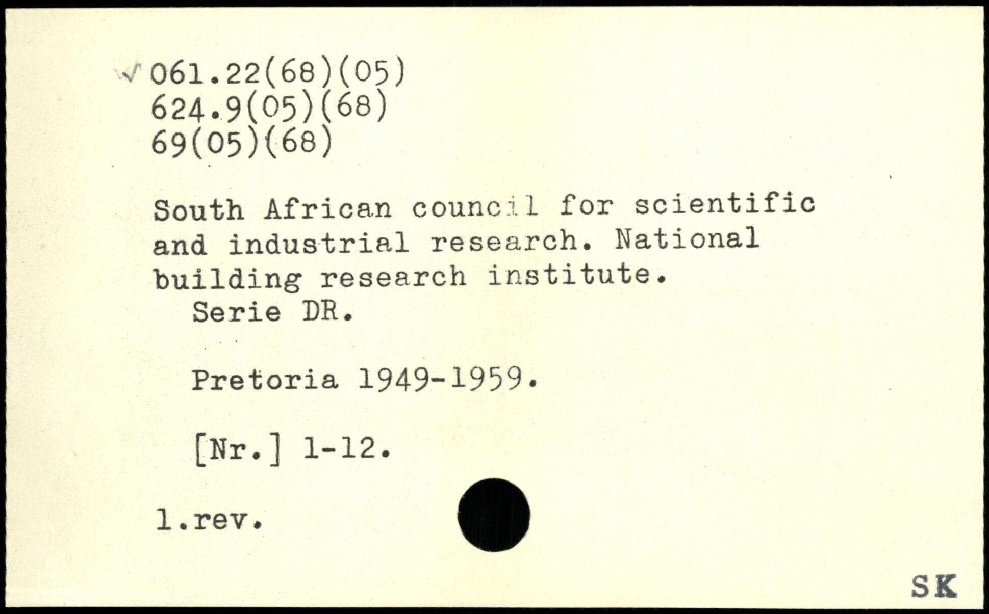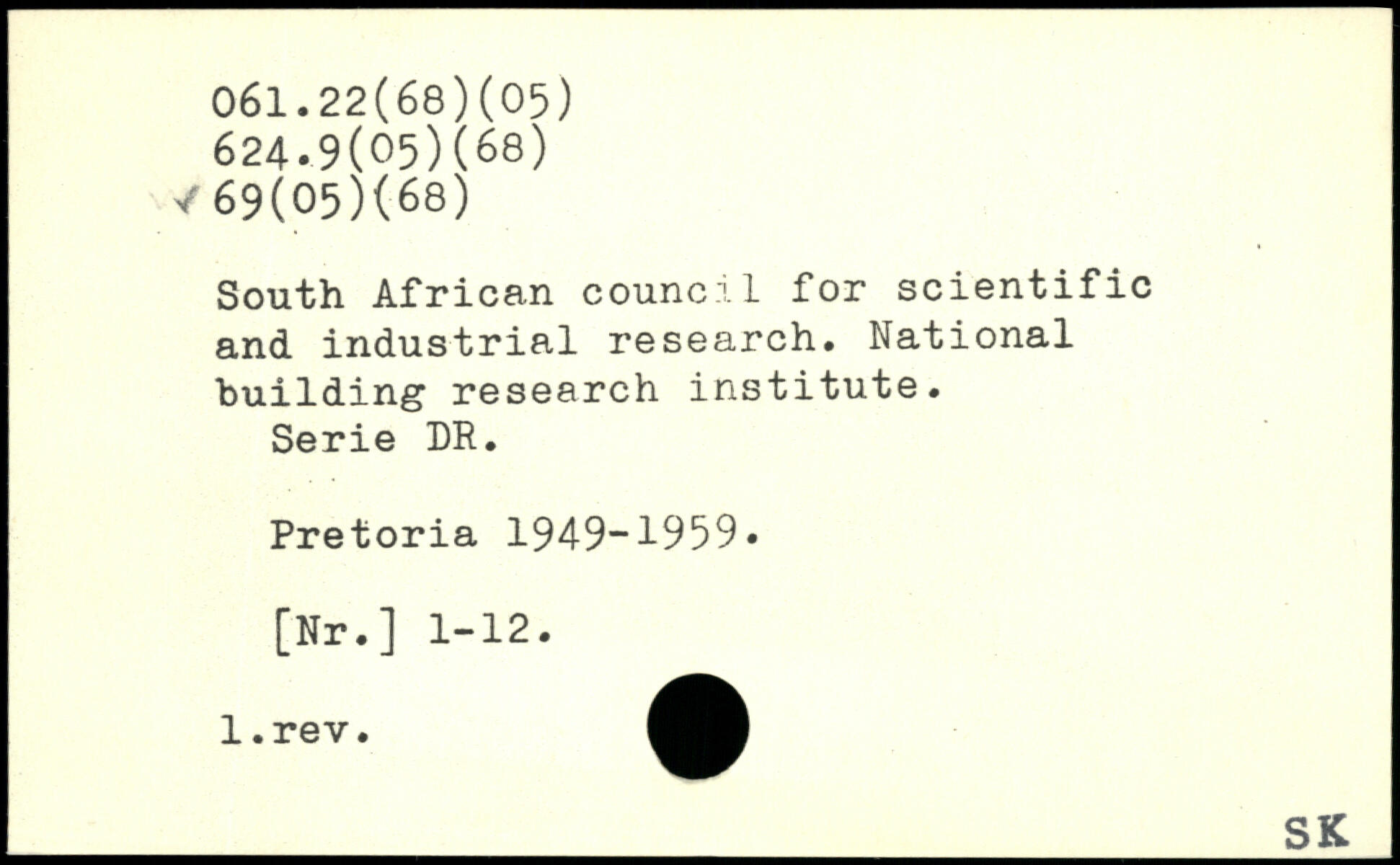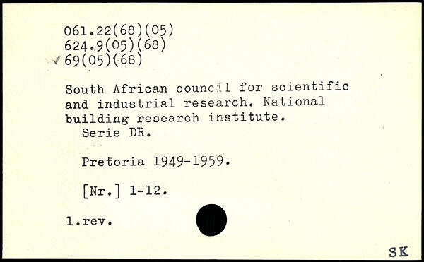 South African council for scientific and industrial research. National building research institute. Serie DR. Pretoria 1949-1959, [Nr.] 1-12.