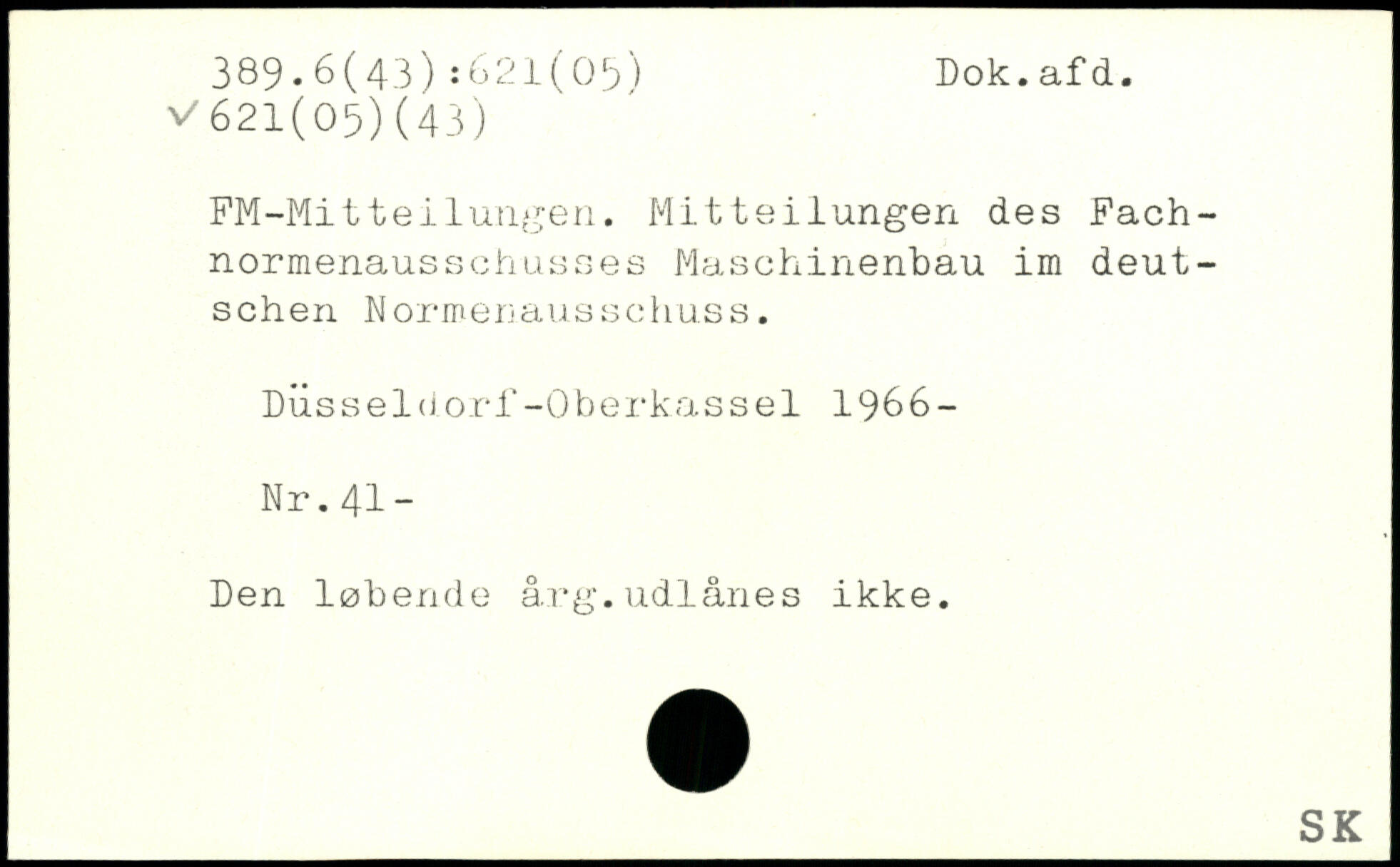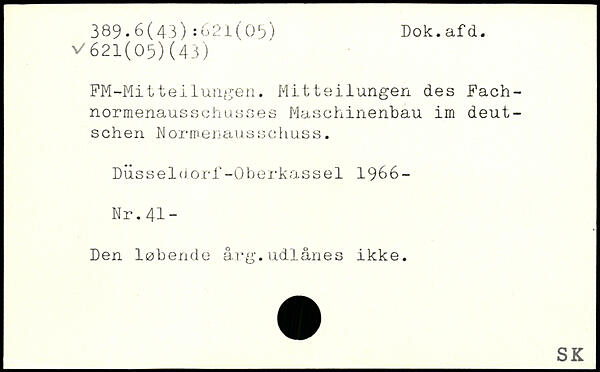 FM-Mitteilungen. Mitteilungen des Fachnormenausschusses Maschinenbau im deutschen Normenausschuss. Düsseldorf-Oberkassel 1966- Nr.41- Den løbende årg.udlånes ikke.