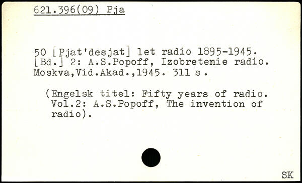 ^0 LPjat'desjatJ let radio 1895-1945. [Bd.j 2: A.S.Popoff, Izobretenie radio. Moskva,Vid.Akad.,1945.