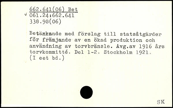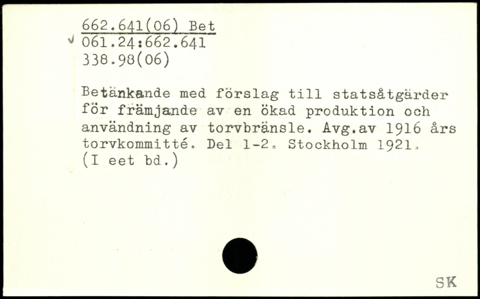 Betänkande med förslag till statsåtgärder Bör främjande av en ökad produktion och användning av torvbransle. Avg.av 1916 års torvkommitté, Del 1-2. Stockholm I.921,