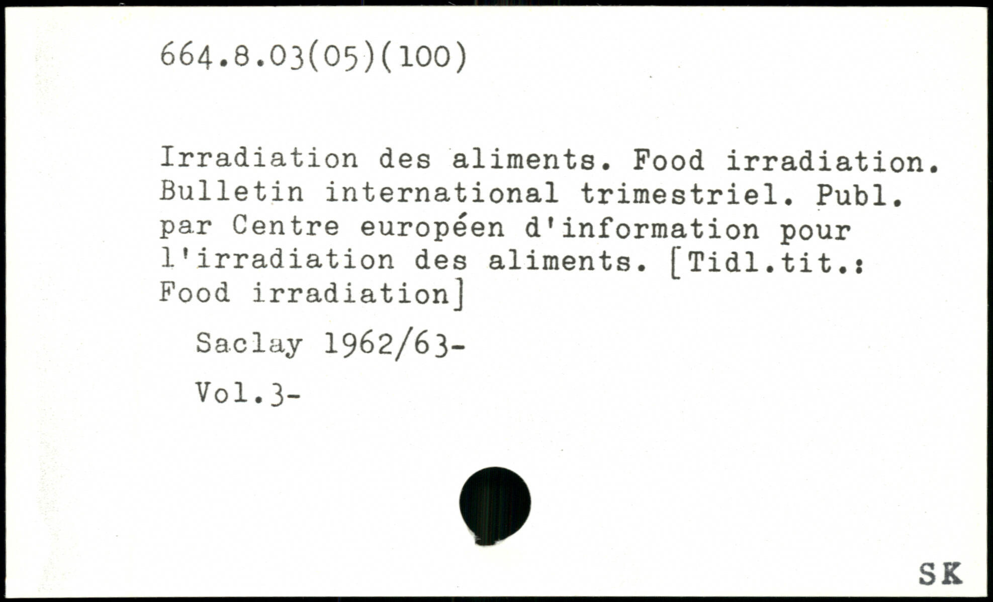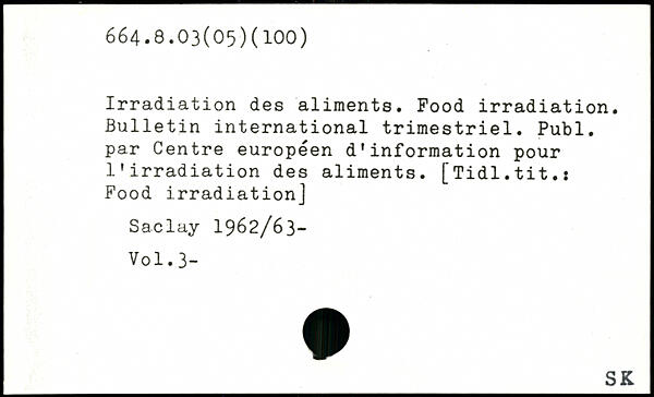 Irradiation des aliments. Food irradiation. Bulletin international trimestriel. Publ. par Centre européen d'information pour l'irradiation des aliments. [Tidl.tit.: Food irradiation] Saclay 196 2/6 3—