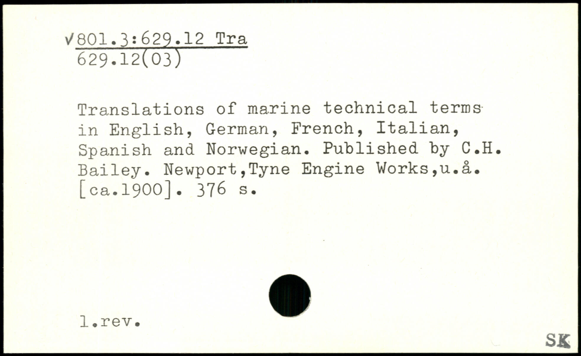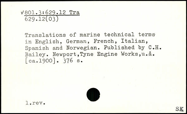 Translations of marine technical terms in English, German, French, Italian, Spanish and Norwegian. Published by C.H. Bailey. Newport,Tyne Engine Works,u.a. [ca.1900].