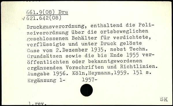 Druckgasverordnung, enthaltend die Polizeiverordnung über die ortsbeweglichen geschlossenen Behälter für verdichtete, verflüssigte und unter Druck gelöste Oase vom 2.Dezember 1935, nebst Techn. Orundsätzen sowie die bis Ende 1955 veröffentlichten oder bekanntgewordenen ergänzenden Vorschriften und Richtlinien. Ausgabe 1956.