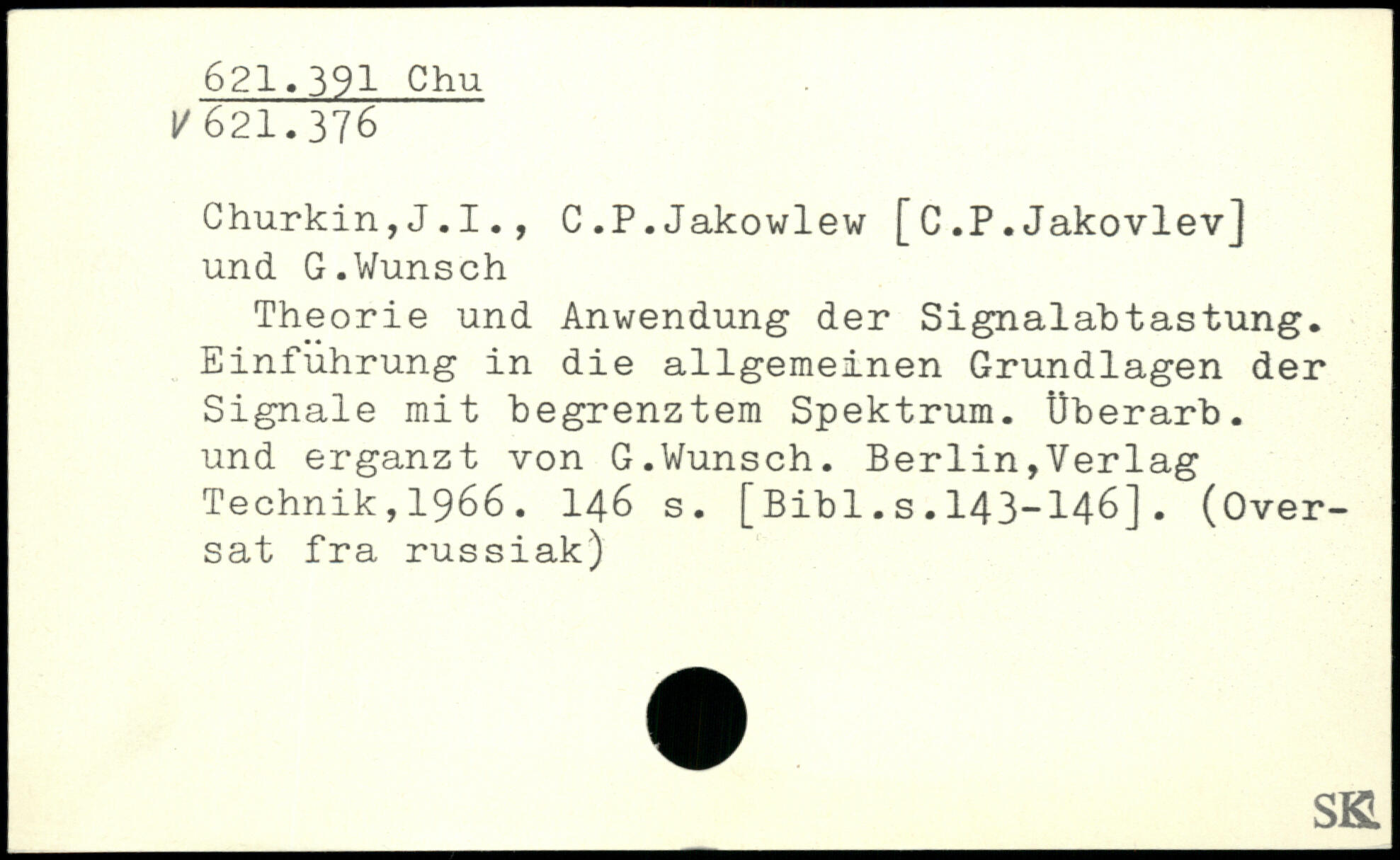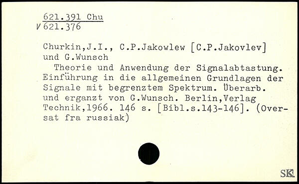 Churkin,J.I., C.P.Jakowlew [C.P.Jakovlev] und G.Wunsch Theorie und Anwendung der Signalabtastung. Einführung in die allgemeinen Grundlagen der Signale mit begrenztem Spektrum. Überarb. und ergänzt von G.Wunsch.