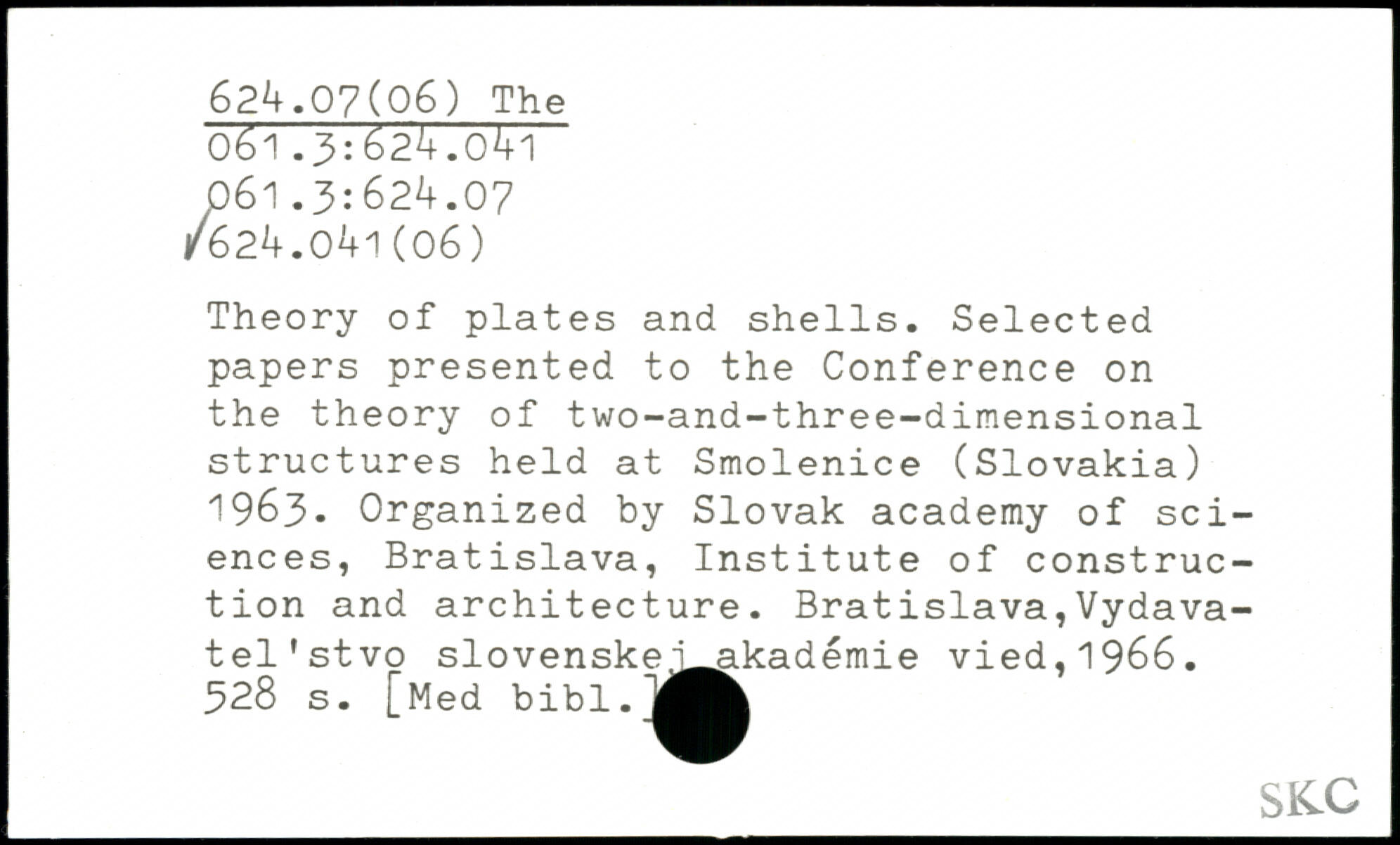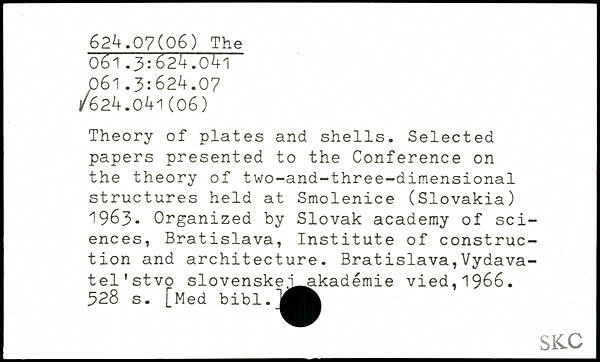 Theory of plates and shells. Selected papers presented to the Conference on the theory of two-and-three-dimensional structures held at Smolenice (Slovakia) 1963. Organized by Slovak academy of sciences, Bratislava, Institute of construction and architecture. Bratislava,Vydava-tel'stvo slovenskei_akademie vied,1966.