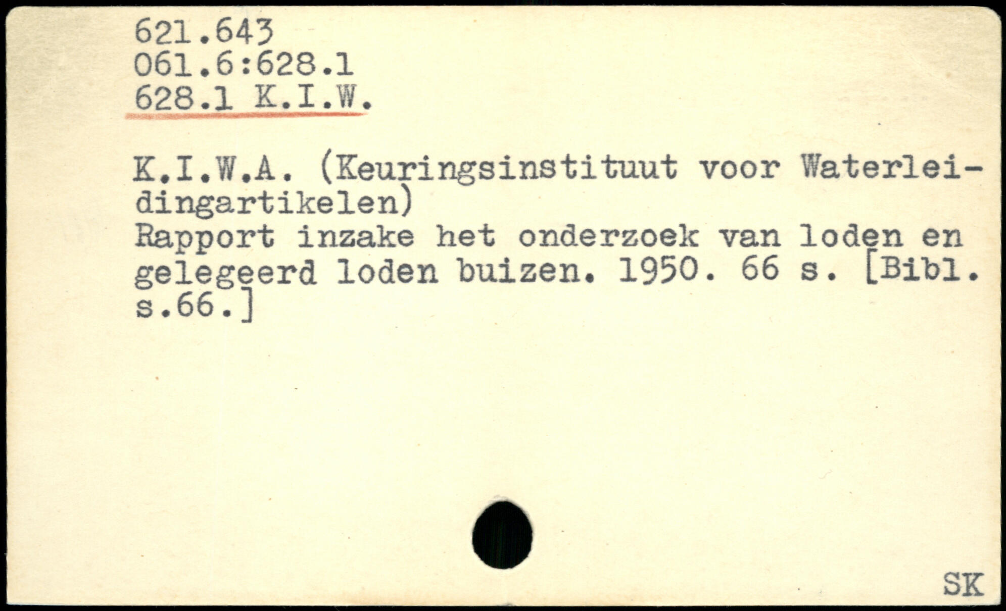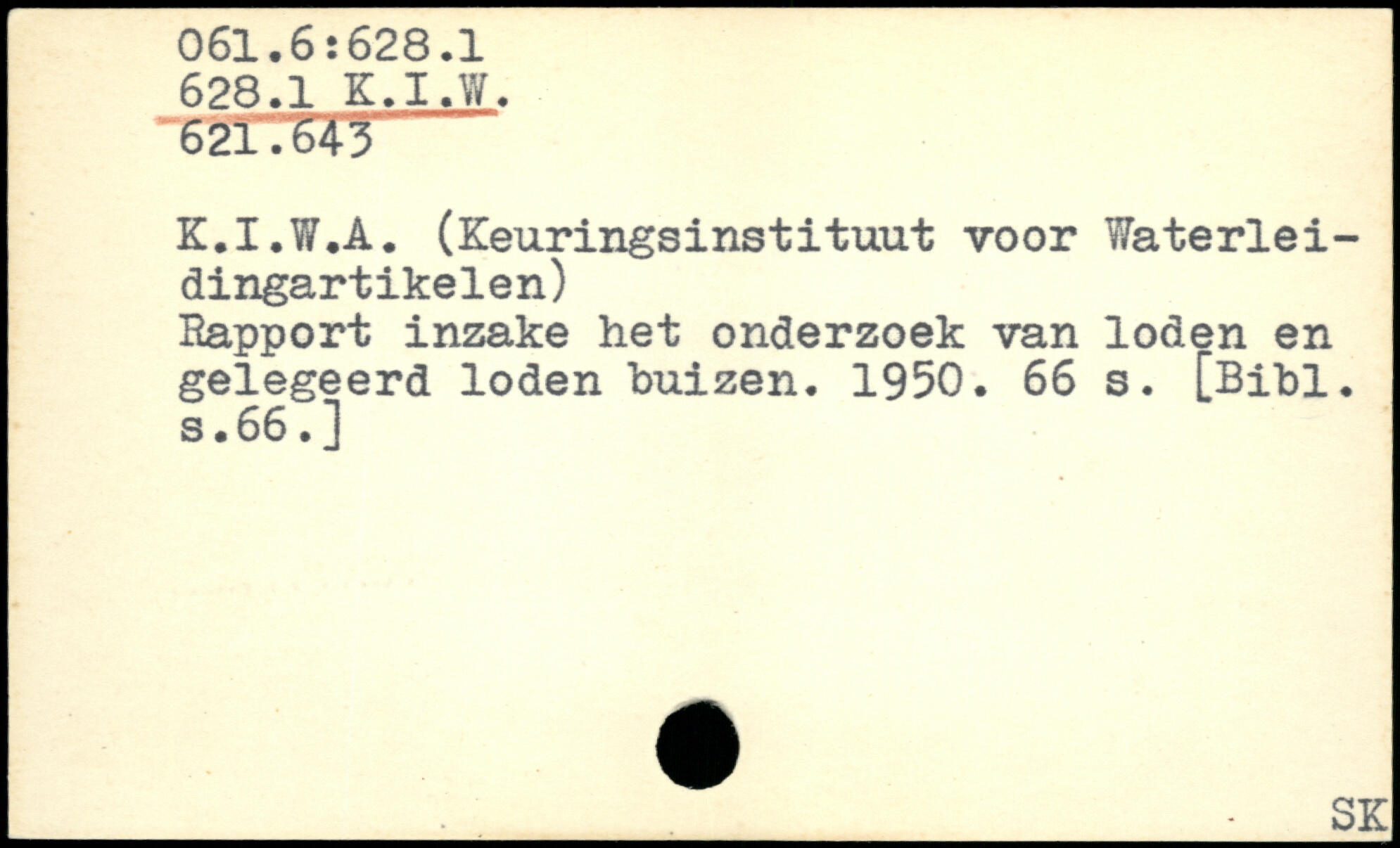 K.I.W.A. (Keuringsinstituut voor Waterlei-dingartikelen) Rapport inzake het onderzoek van loden en gelegeerd loden buizen. 1950.