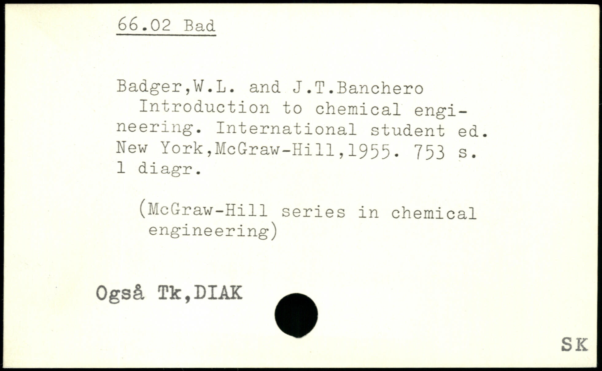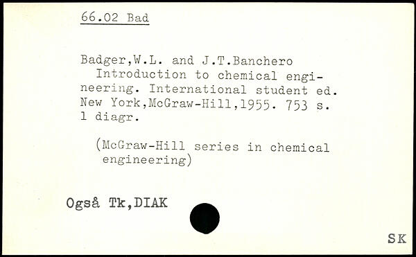Badger,W.L. and J.T.Banchero Introduction to chemical engineering. International student ed.