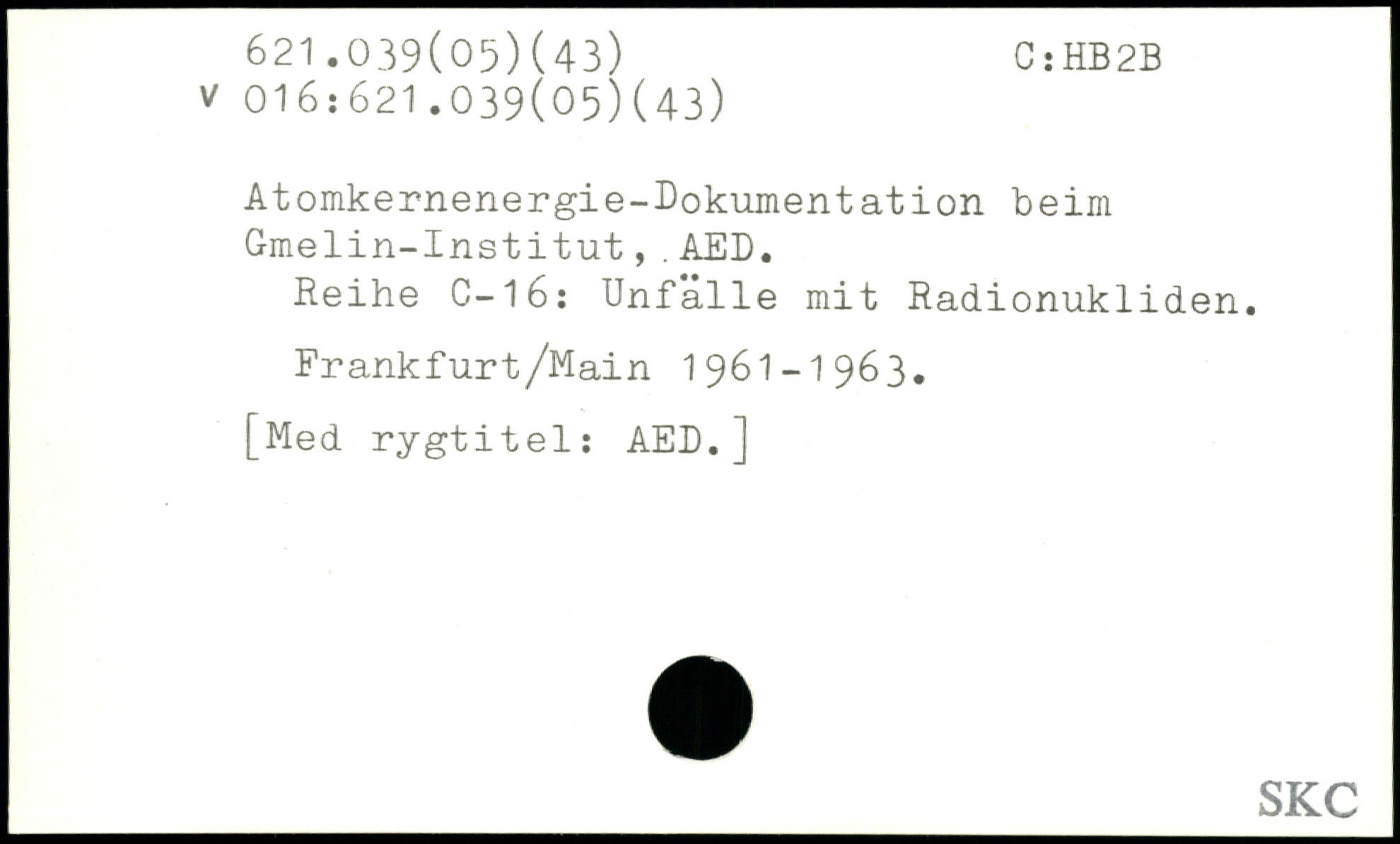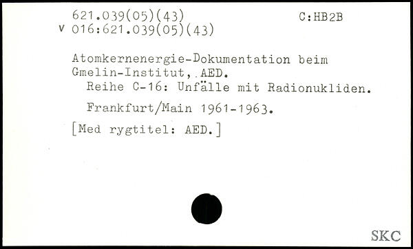 Atomkernenergie-Dokumentation beim Gmelin-Institut,.AED. Reihe C— 1 6: Unfälle mit Radionukliden. Frankfurt/Main 1961 — 196 3.