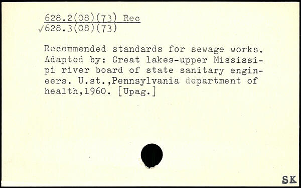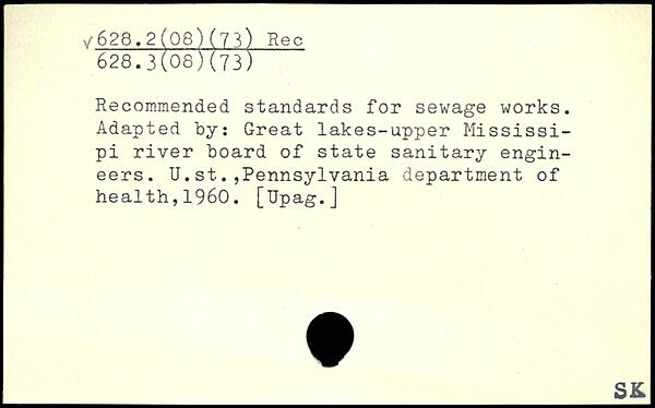 Recommended standards for sewage works. Adapted by: Great lakes-upper Mississi-pi river board of state sanitary engineers. TJ. st. ,Pennsylvania department of health,1960. [Upag.]