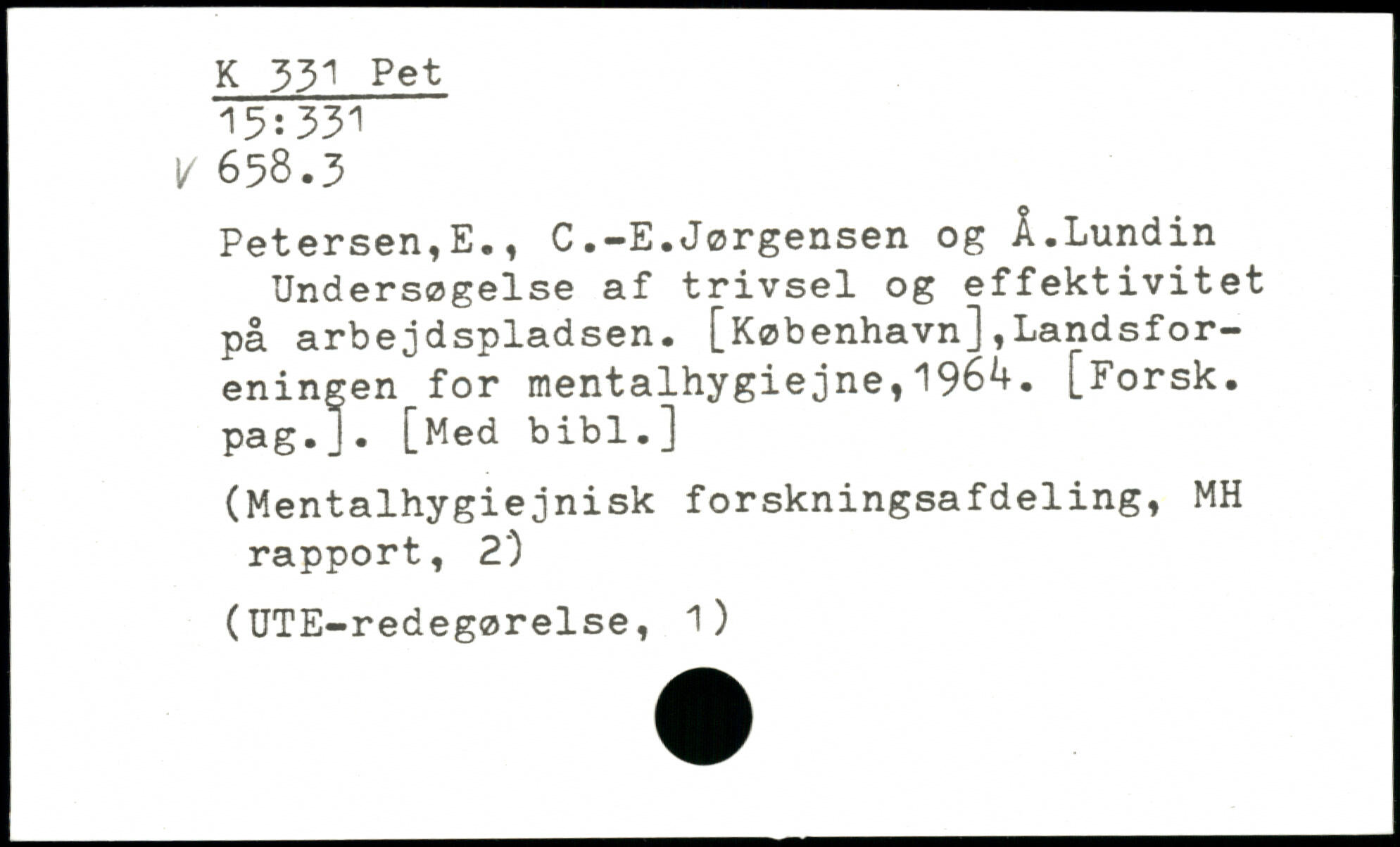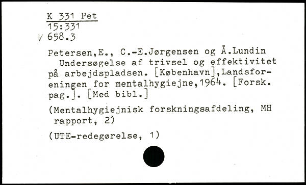 Petersen,E., C.-E.Jørgensen og Å.Lundin Undersøgelse af trivsel og effektivitet på arbejdspladsen. [København],Landsforeningen for mentalhygiejne,1964. [Forsk. pag.J. [Med bibl.]