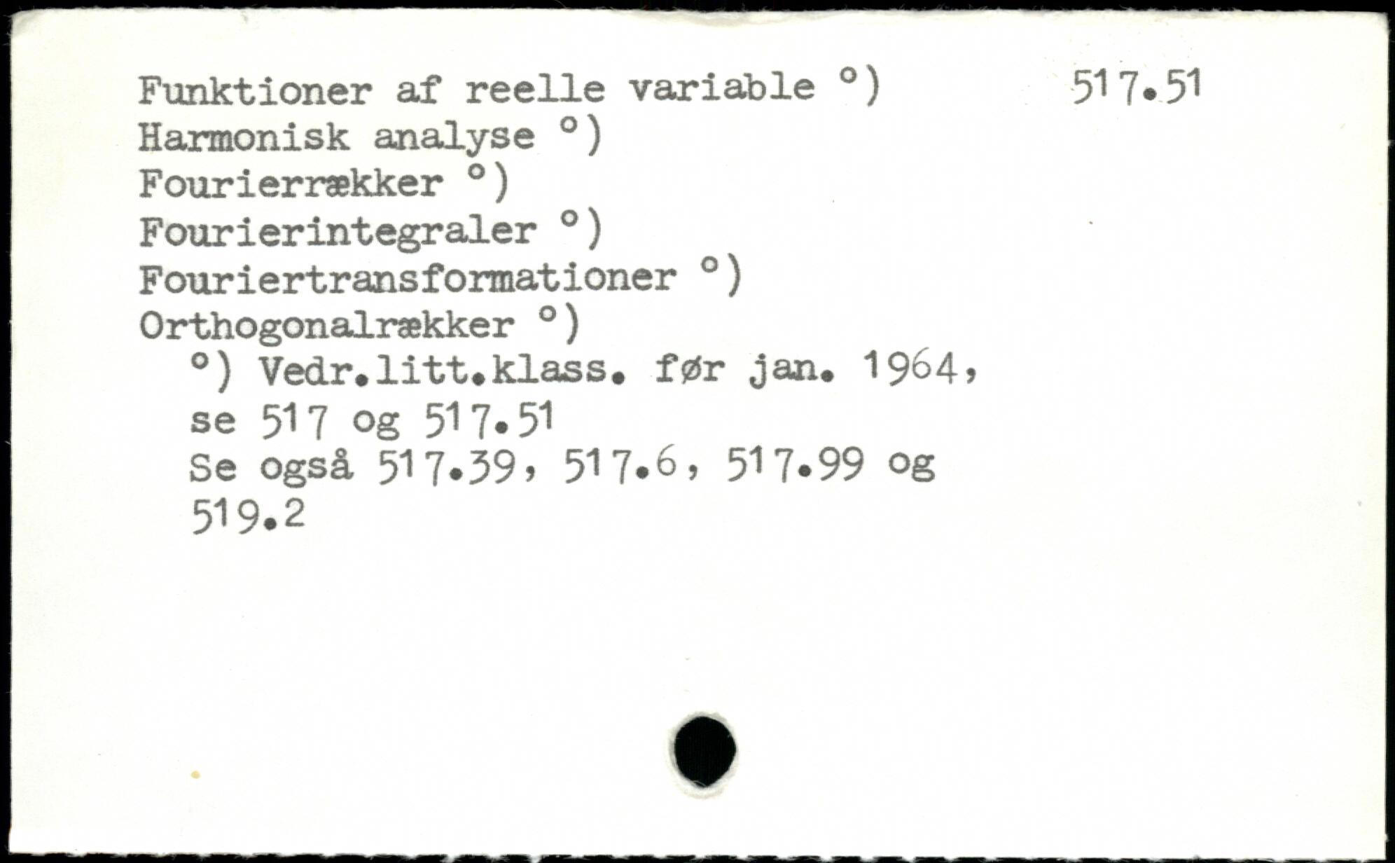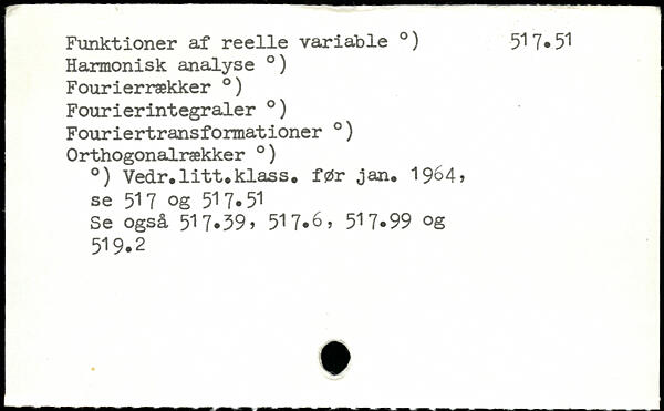Funktioner af reelle variable .) 517.51 Harmonisk analyse .) Fourierrækker .) Fourierintegraler .) Fouriertransformationer. ) Orthogonalrækker .) .) Vedr.litt.klass, før jan. 19^4, se 517 og 51 7.