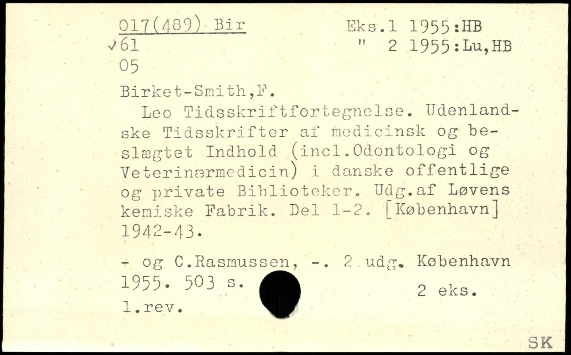 Leo Tidsskriftfortegnelse. Udenlandske Tidsskrifter af medicinsk og beslægtet Indhold (incl.Odontologi og i Veterinærmedicin) i danske offentlige og private Biblioteker. Udg.af Løvens kemiske Fabrik. Del 1-2.