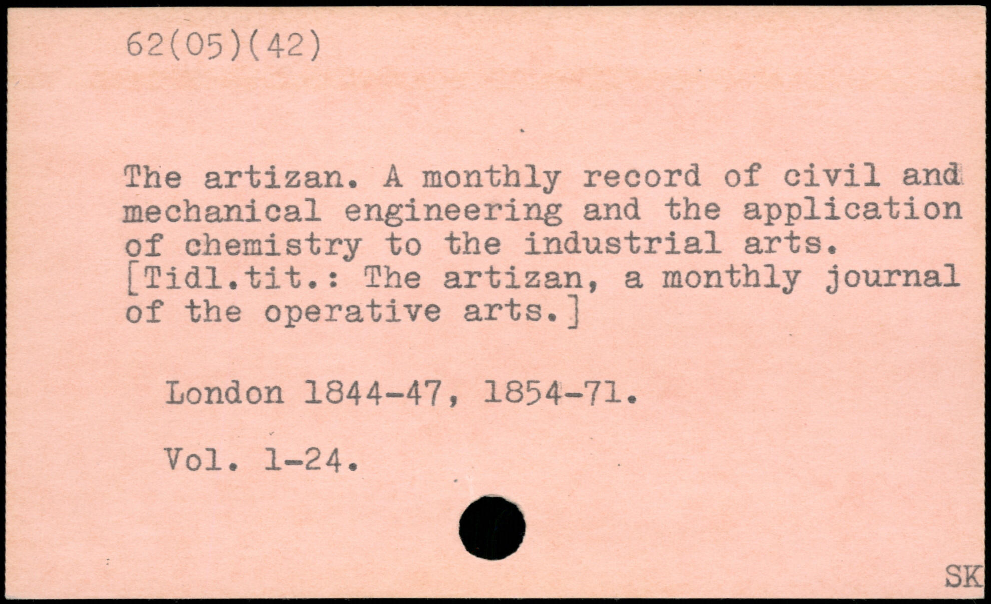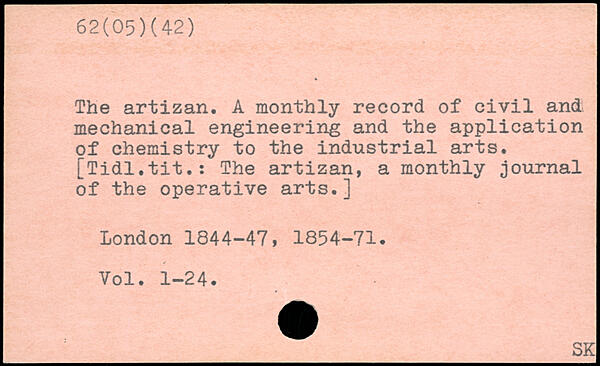 The artizan. A monthly record of civil and mechanical engineering and the application of chemistry to the industrial arts. [Tidl.tit.: The artizan, a monthly journal of the operative arts.]