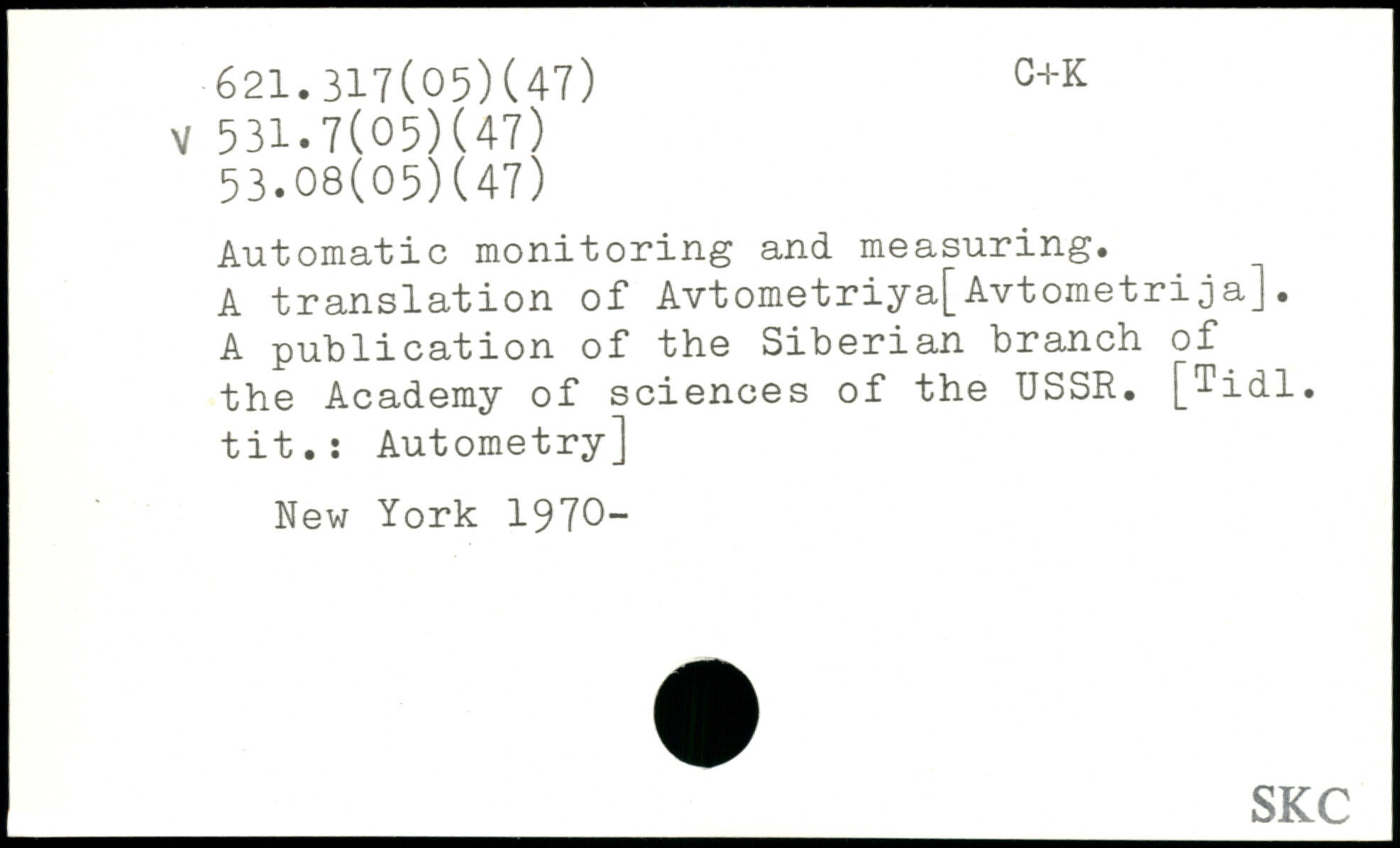 Automatic monitoring and measuring. A translation of Avtometriya[Avtometrija]. A publication of the Siberian branch of the Academy of sciences of the USSR. [Tidl. tit.: Autometry]