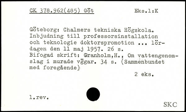 Göteborg: Chalmers tekniska Högskola. Inbjudning till professorsinstallation och teknologie doktorspromotion ... lördagen den 11 maj 1957