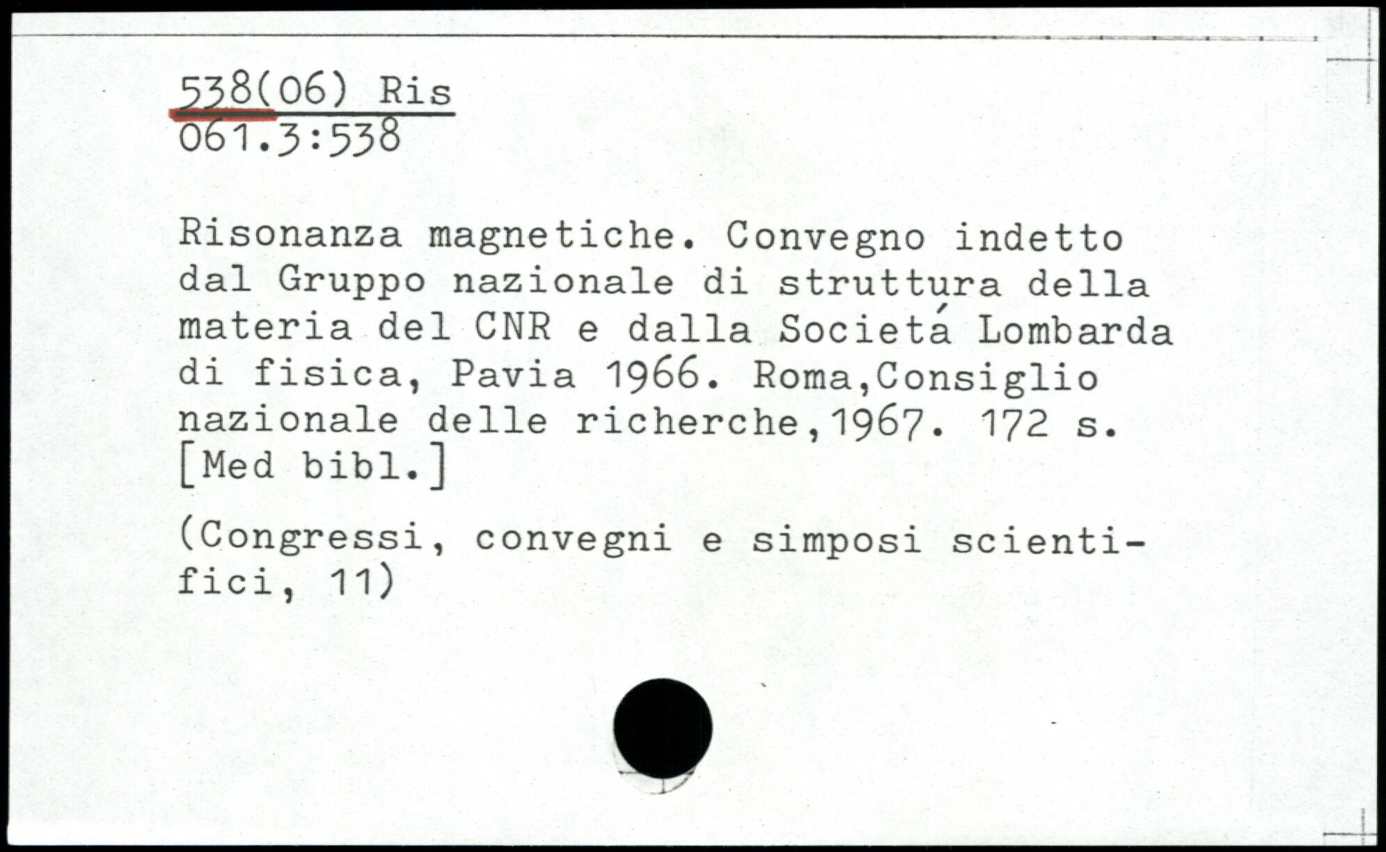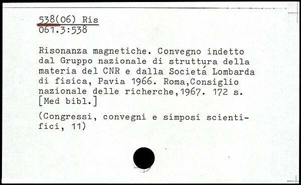 Risonanza magnetiche. Convegno indetto dal Gruppo nazionale di struttura della materia del CNR e dalla Societa Lombarda di fisica, Pavia 1966.