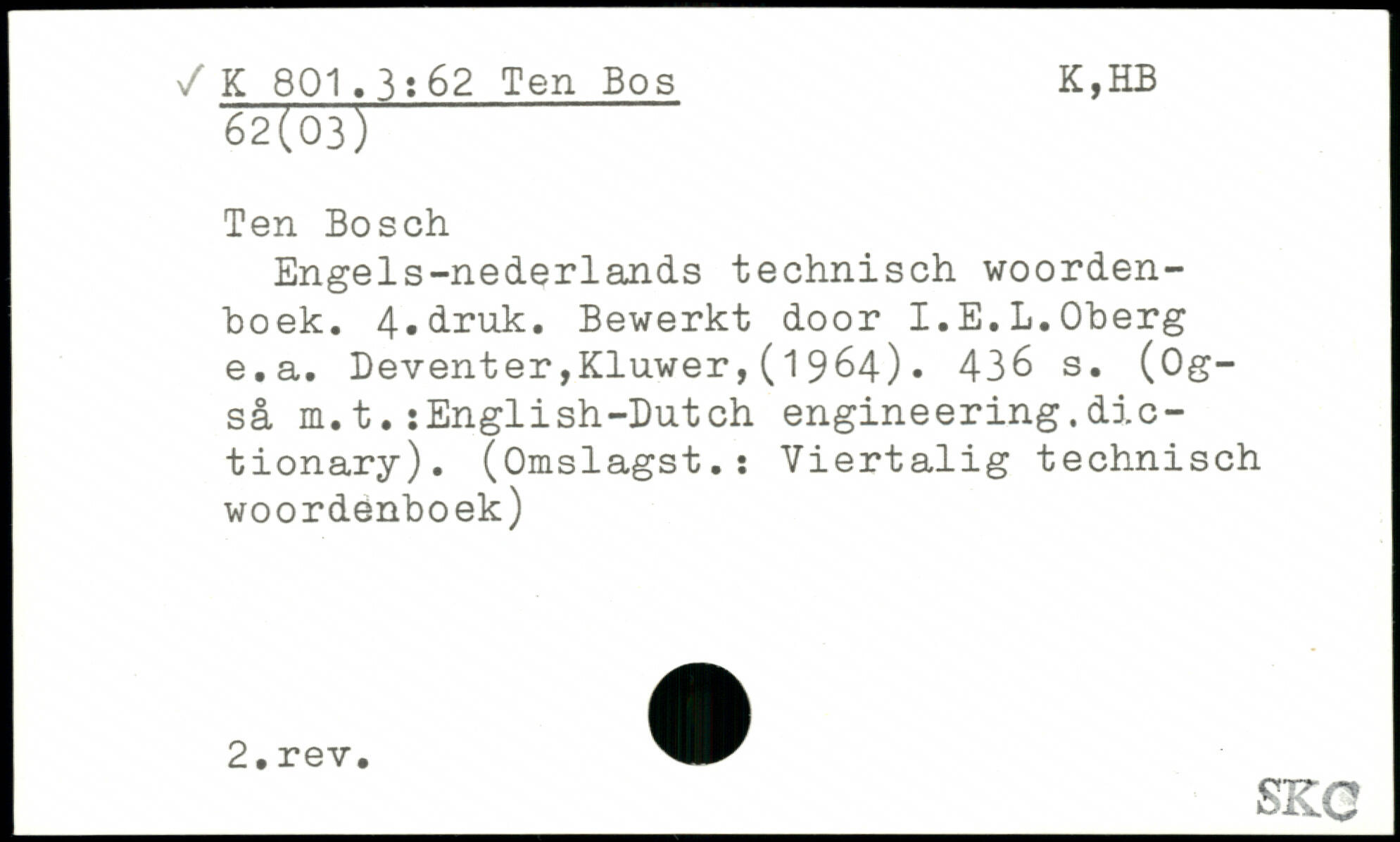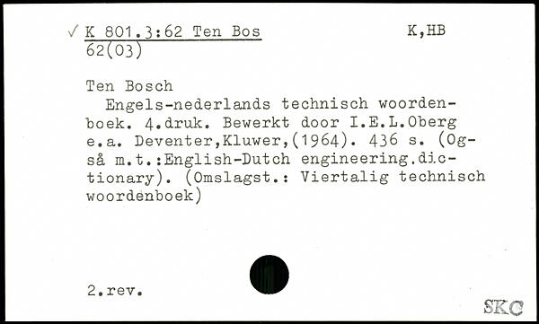 Ten Bosch Engels-nederlands technisch woorden-boek. 4.druk. Bewerkt door I.E.L.Oberg e.a. Deventer,Kluwer,(1964).