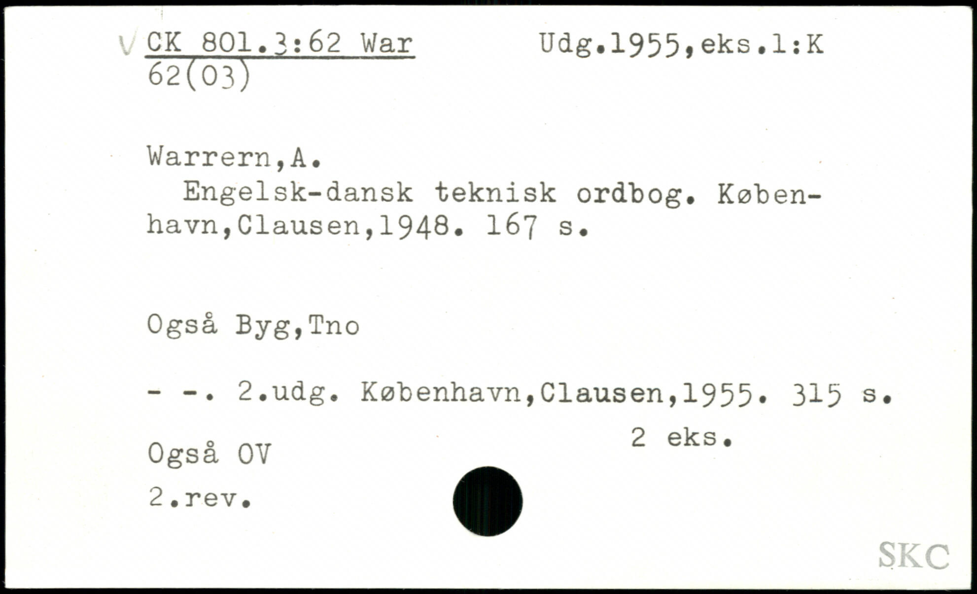 Engelsk-dansk teknisk ordbog, København, Clausen,1948, 167 s. Også Byg,Tno - 2,udg. København,Clausen,1955. 315 s. n o n.T 2 eks. Også OY