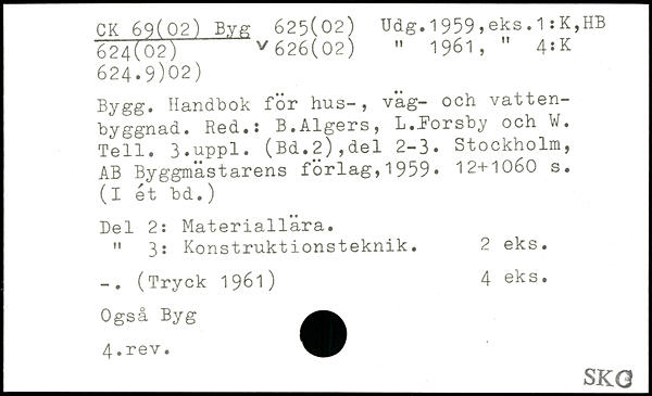 1961, " 4:K 624.9)02) Bygg. Handbok för hus-, väg- och vattenbyggnad. Red. i B.Algers, L..Forsby och W. Tell.
