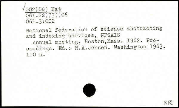 National federation of science abstracting and indexing services, NFSAIS Annual meeting, Boston,Mass. 1962. Proceedings. Ed.: R.A.Jensen.