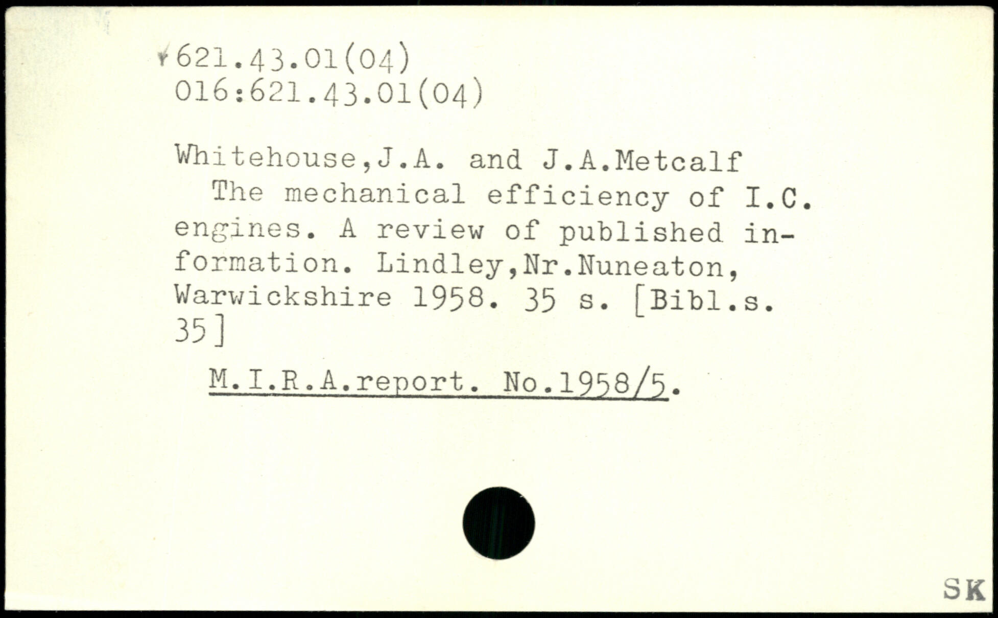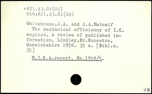 Vhitehouse,J.A. and J.A.Metcalf The mechanical efficiency of I.C. engines. A review of published information. Lindley,Nr.Nuneaton, Warwickshire 1958.