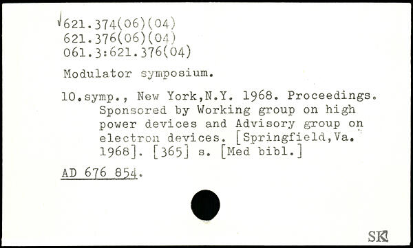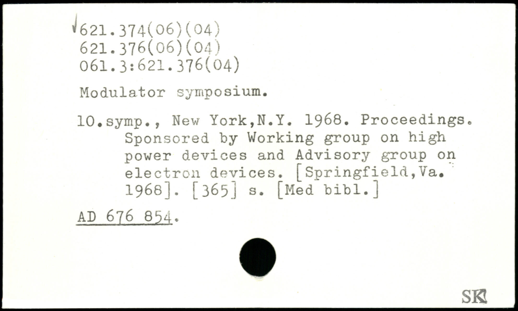 Modulator symposium. lO.symp., New York,N.Y. 1968. Proceedings. Sponsored by Working group on high power devices and Advisory group on electron devices. [Springfield,Va. 1960]. [365] s. [Med bibl.] AD 676 894