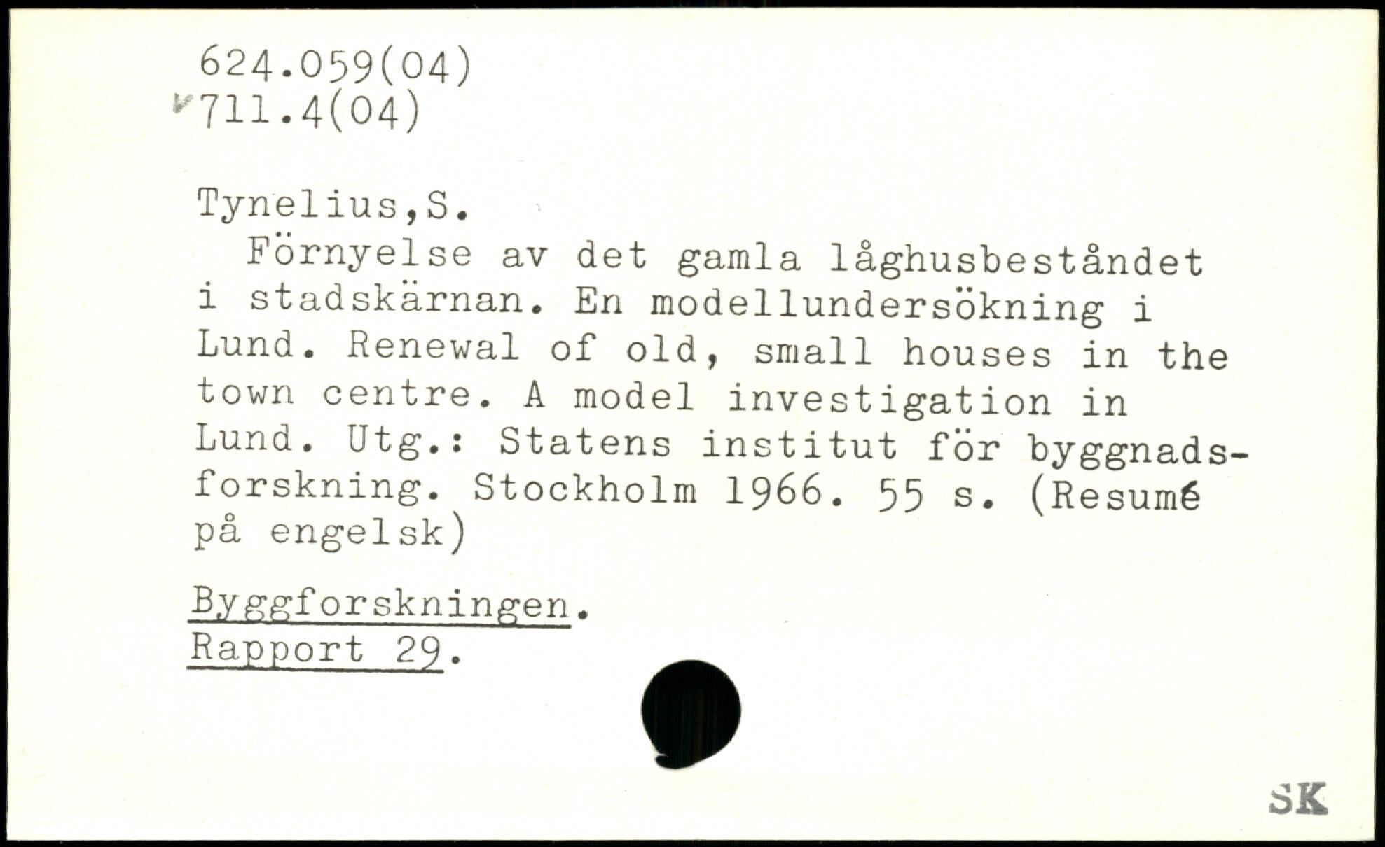 Förnyelse av det gamla låghusbeståndet i stadskarnan. En modellundersökning i Lund. Renewal of old, small houses in the town centre. A model investigation in Lund. Utg.: Statens institut for byggnadsforskning.