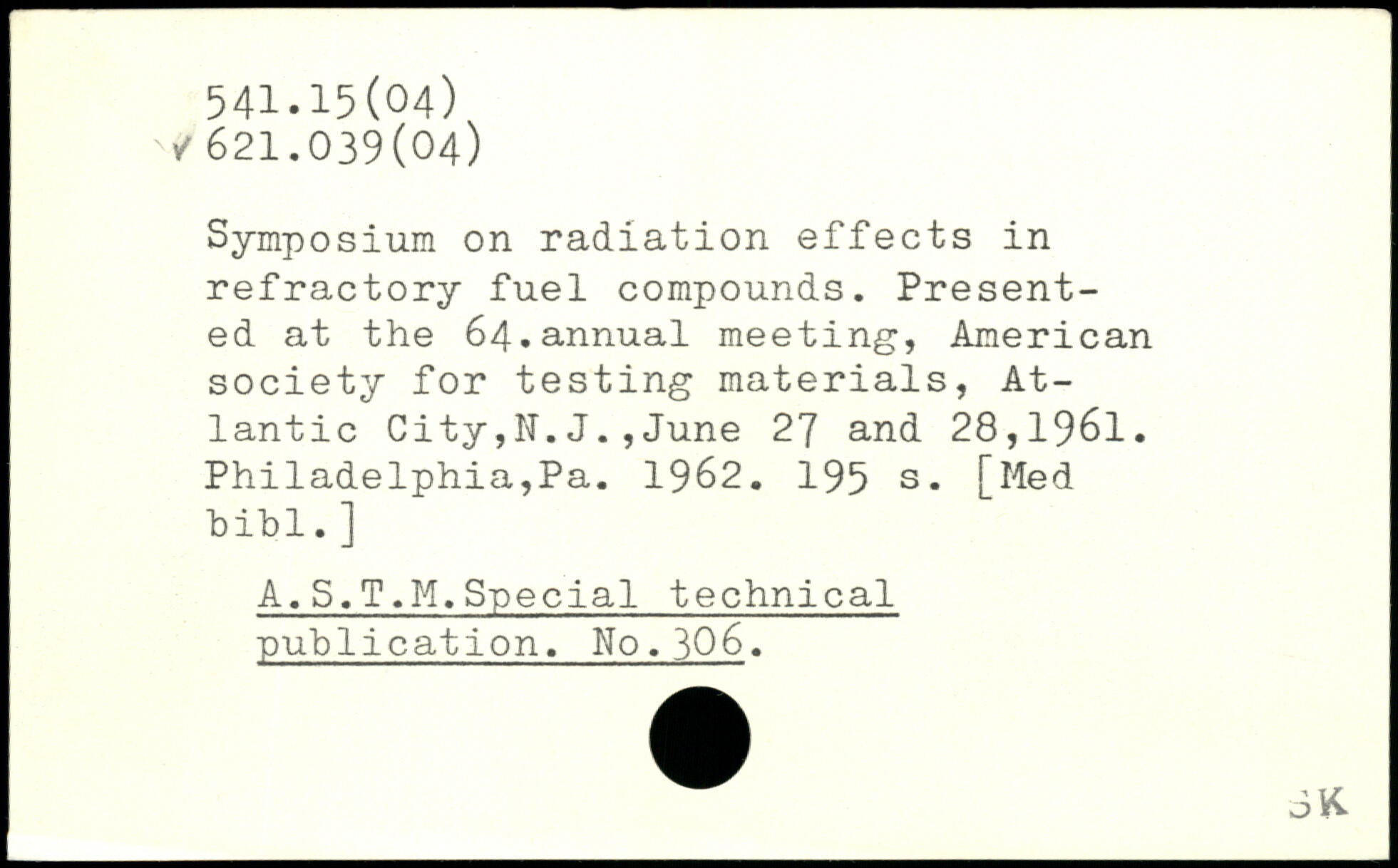 Symposium on radiation effects in refractory fuel compounds. Presented at the 64.annual meeting, American society for testing materials, Atlantic City,N.J.,June 27 and 28,1961. Philadelphia,Pa. 1962.